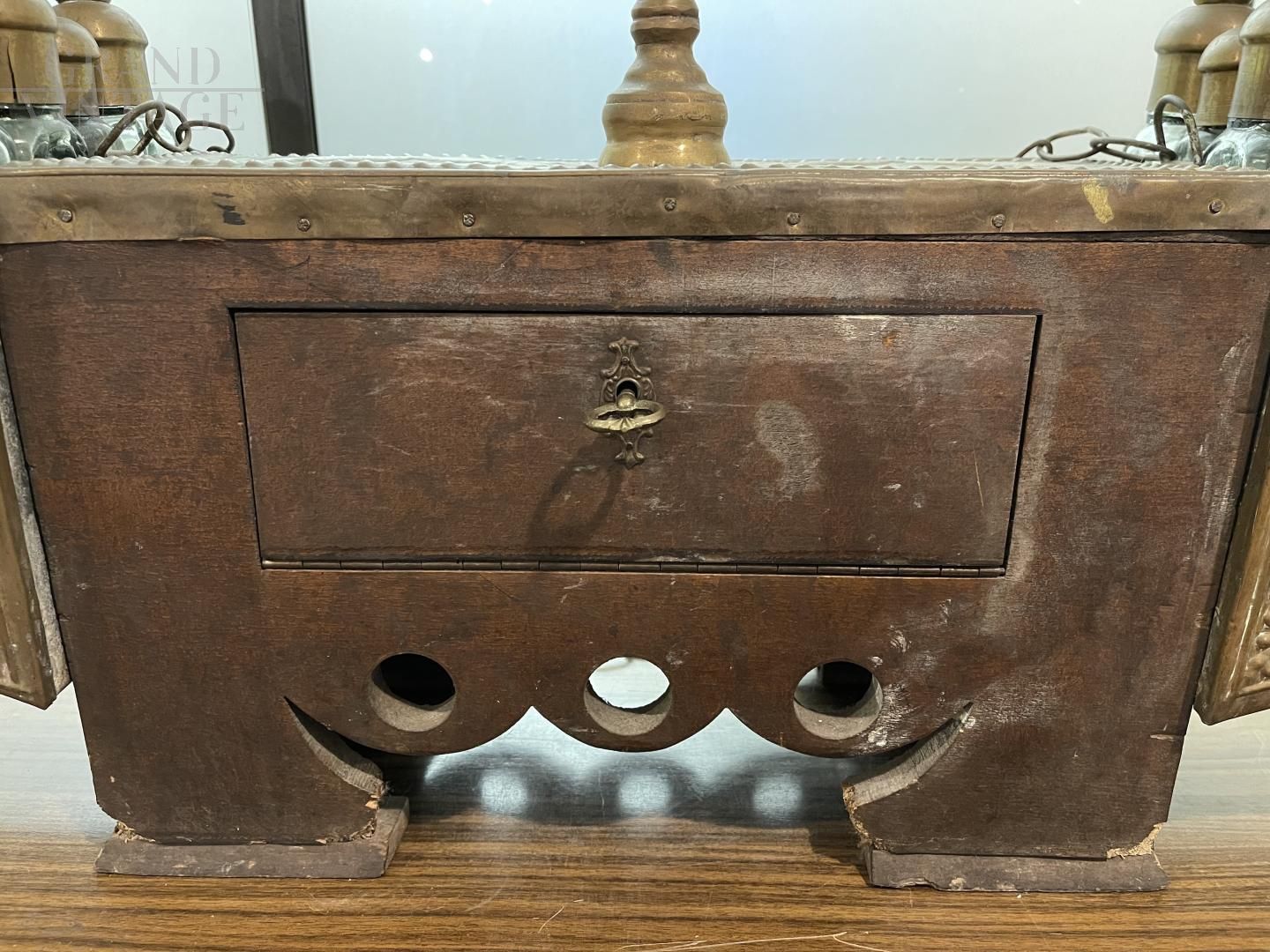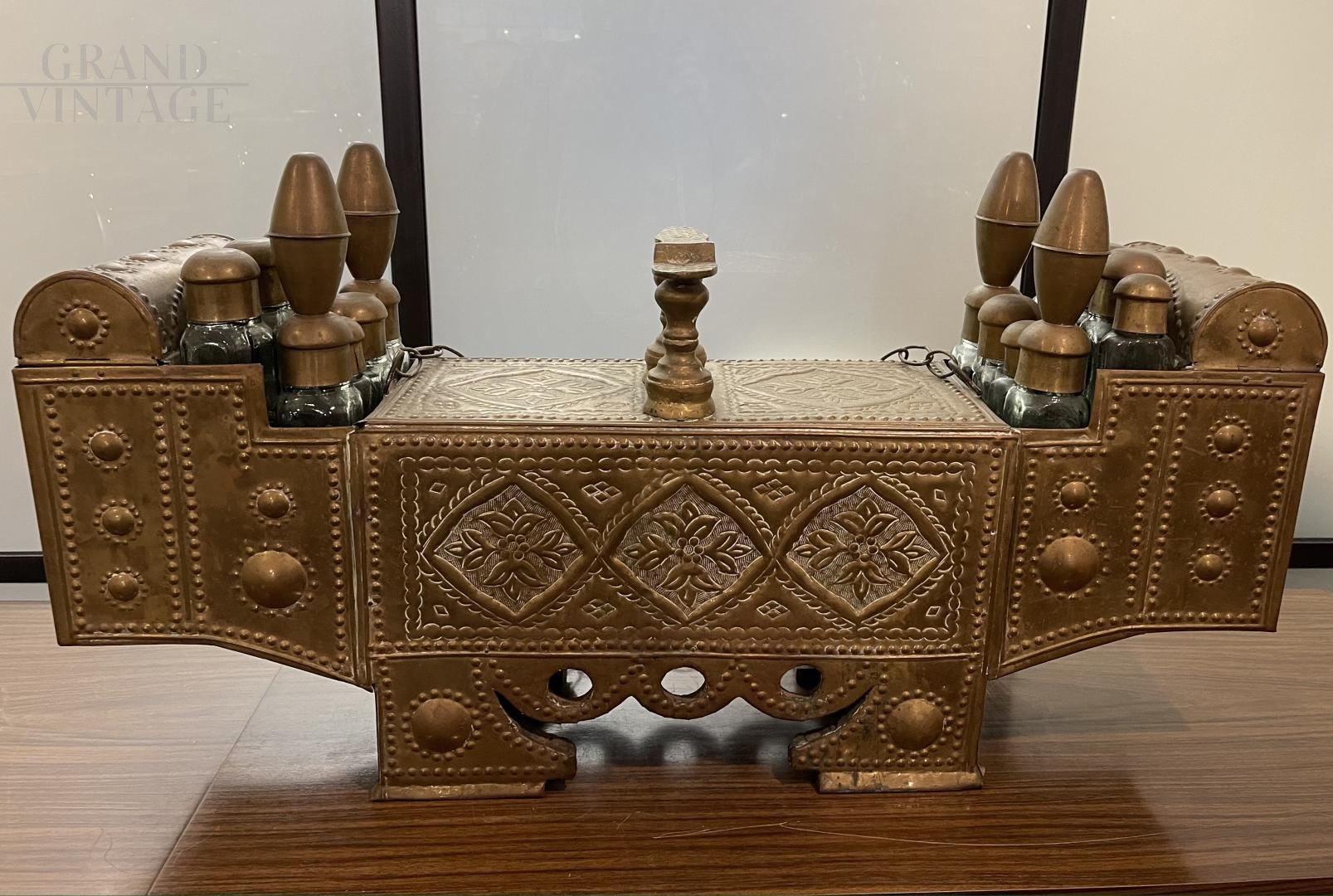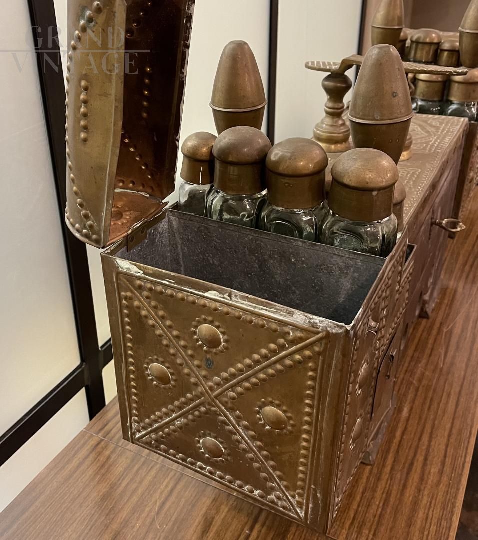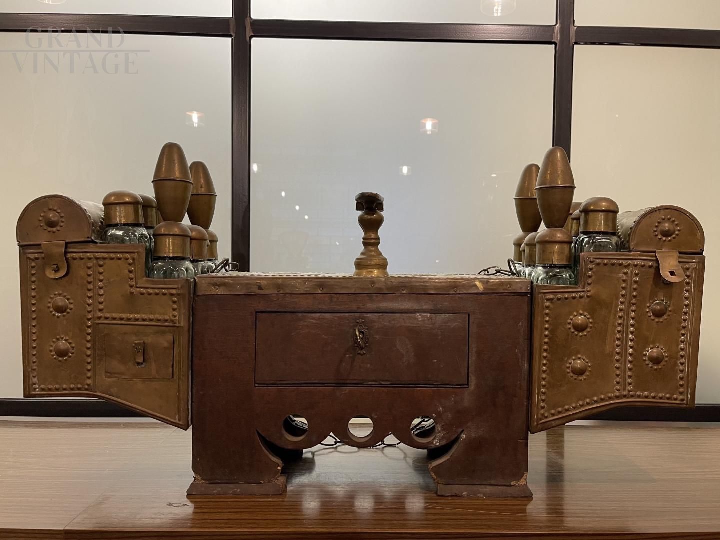 Vecchio mobiletto sciuscià lustrascarpe da strada, con struttura in legno ricoperta in lamiera lavorata a sbalzo, completo di bottigliette in vetro.