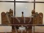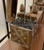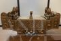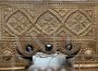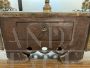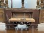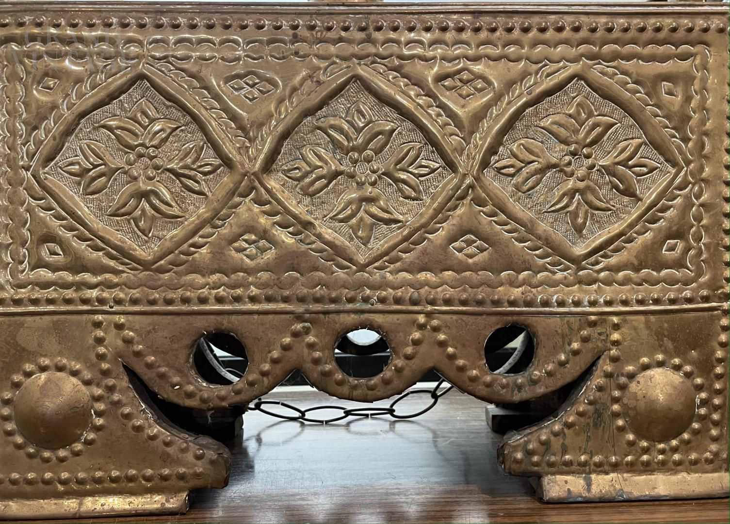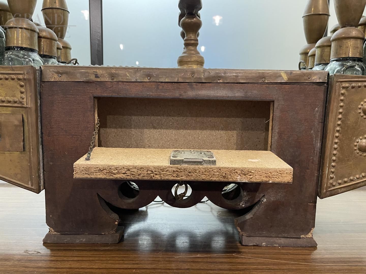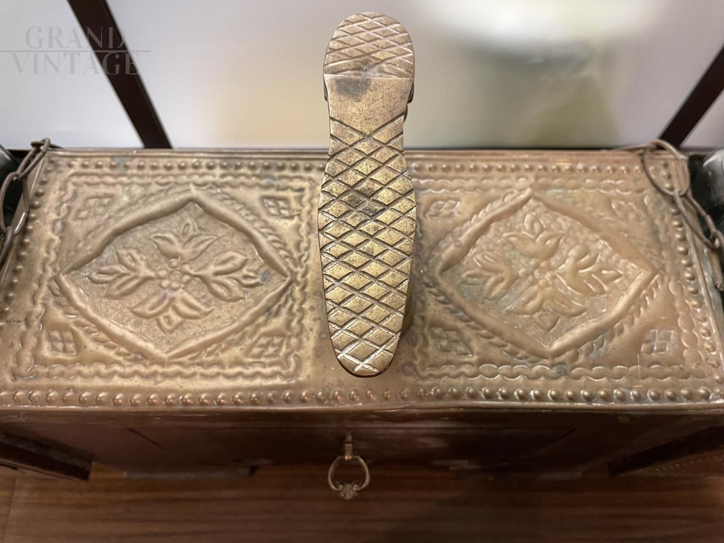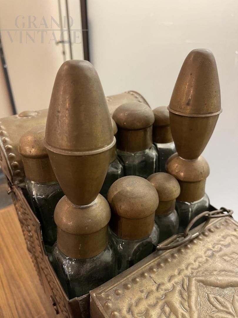 Vecchio mobiletto sciuscià lustrascarpe da strada, con struttura in legno ricoperta in lamiera lavorata a sbalzo, completo di bottigliette in vetro.