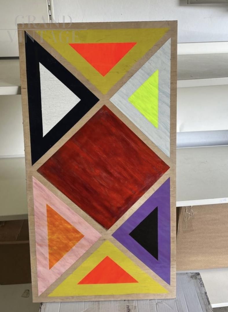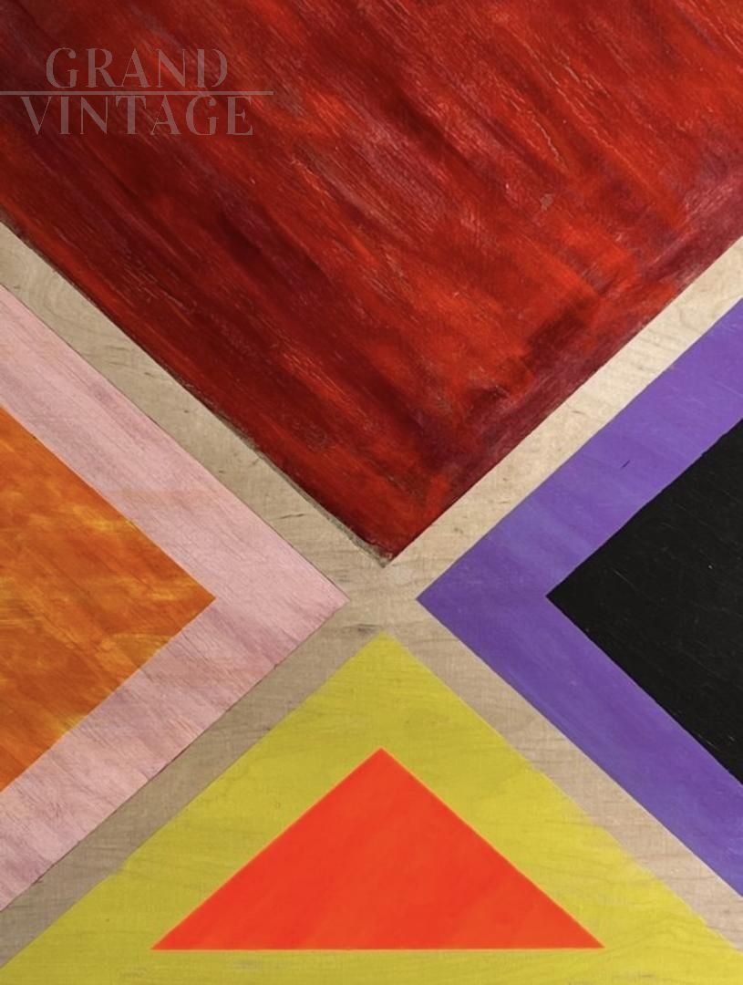 Dipinto astrattista del 2023 realizzato dall'artista siciliano Bruno Carlino (1952) su tavola con tempera e smalto ispirato alle opere di Vittoria Palazzolo, dal titolo Sinergie. Un'opera originale in cui l'artista da sfogo alla propria creatività e alle doti di copista, riuscendo ad eguagliare le celebri opere dell'artista torinese. Opera munita di certificato di originalità.