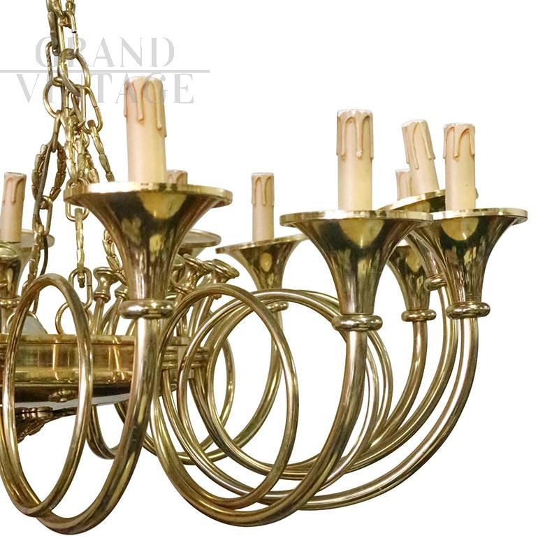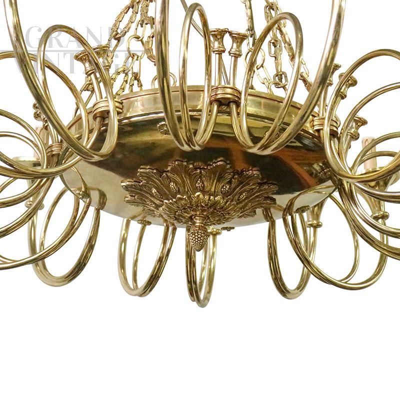 Sontuoso lampadario in bronzo dorato a sedici bracci con altrettante luci su un unico ordine esterno, mentre tre luci sono nascoste sopra la coppa. Il lampadario è dotato di 16 punti luce per lampadine di tipo E14.