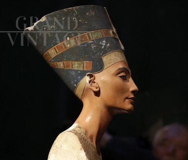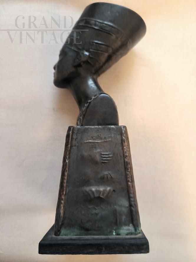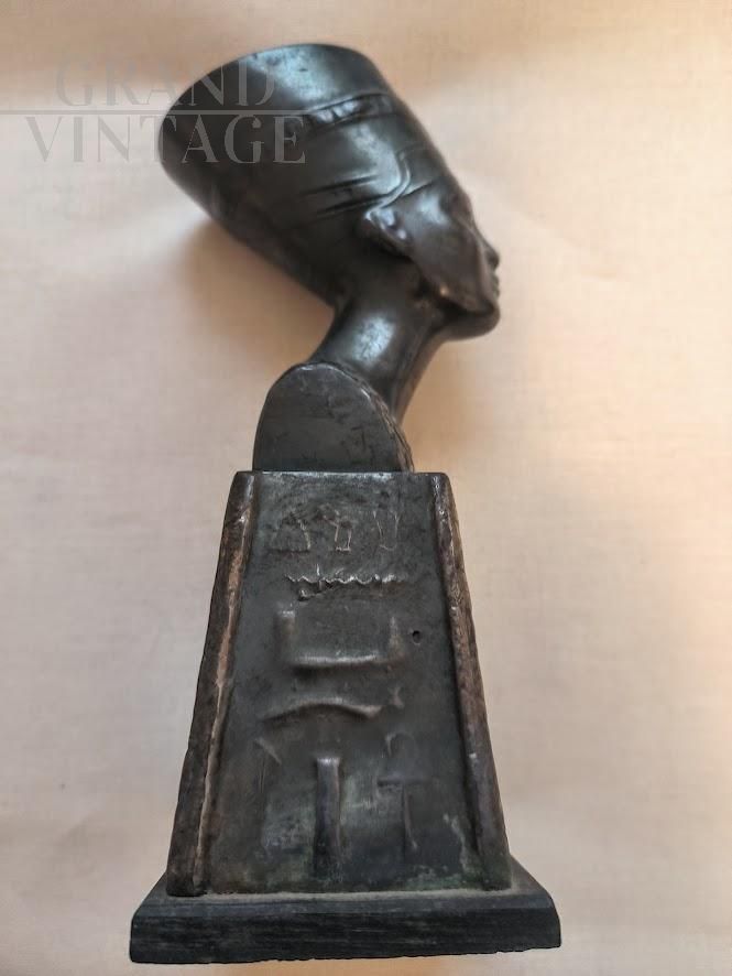 Souvenir D'Égypte con busto della Regina Nefertiti in bronzo, una scultura risalente agli anni '30. Nefertiti aveva seguito il marito, la cui inquietante fisionomia ci affascina e ipnotizza da secoli, quando trasferì la capitale da Tebe ad Amarna, abolendo il culto del dio Amon e istituendo una religione monoteista il cui dio era Aton, il disco solare. Gli sposi cambiarono, con la residenza, anche il loro nome: Amenhotep (Pace di Amon) divenne Akhenaton (Utile ad Aton); Nefertiti (La bella che è arrivata) si fece chiamare Nefer-neferu-Aton (Aton è raggiante perché la bella è arrivata). La regina morì nel 1339 a. C., a 28 anni, lasciando sei figli.