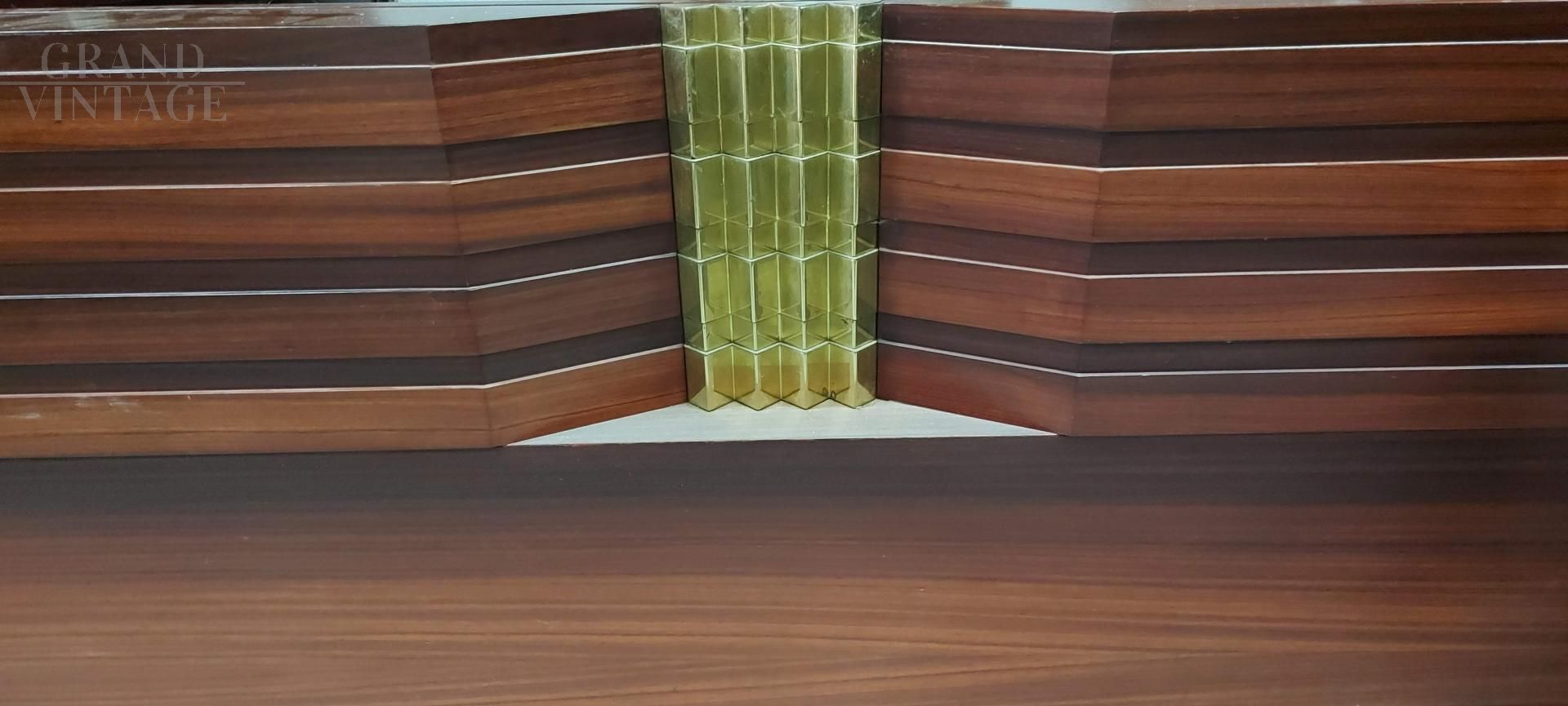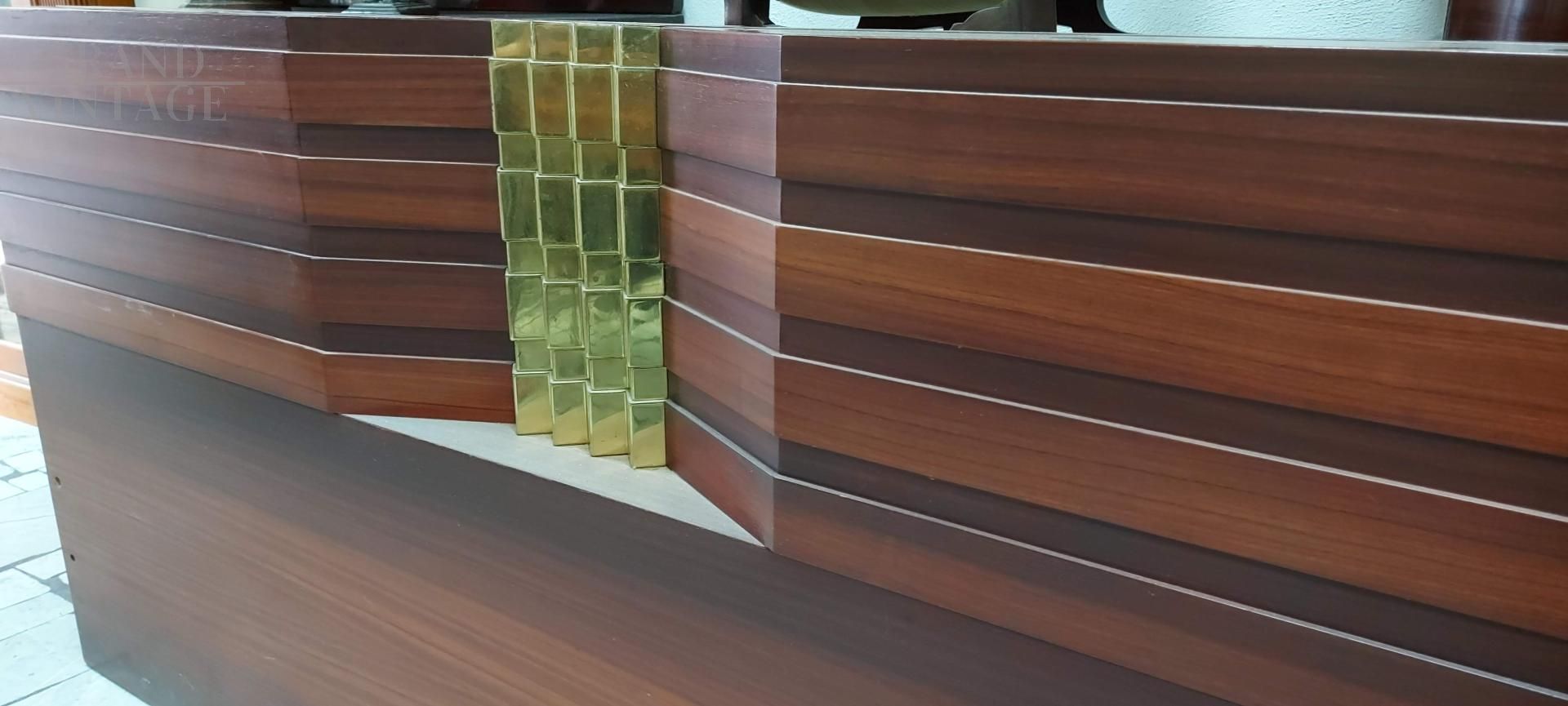 Spalliera per letto a muro in legno Padouk con decoro centrale in ottone, design dell'architetto Frigerio.