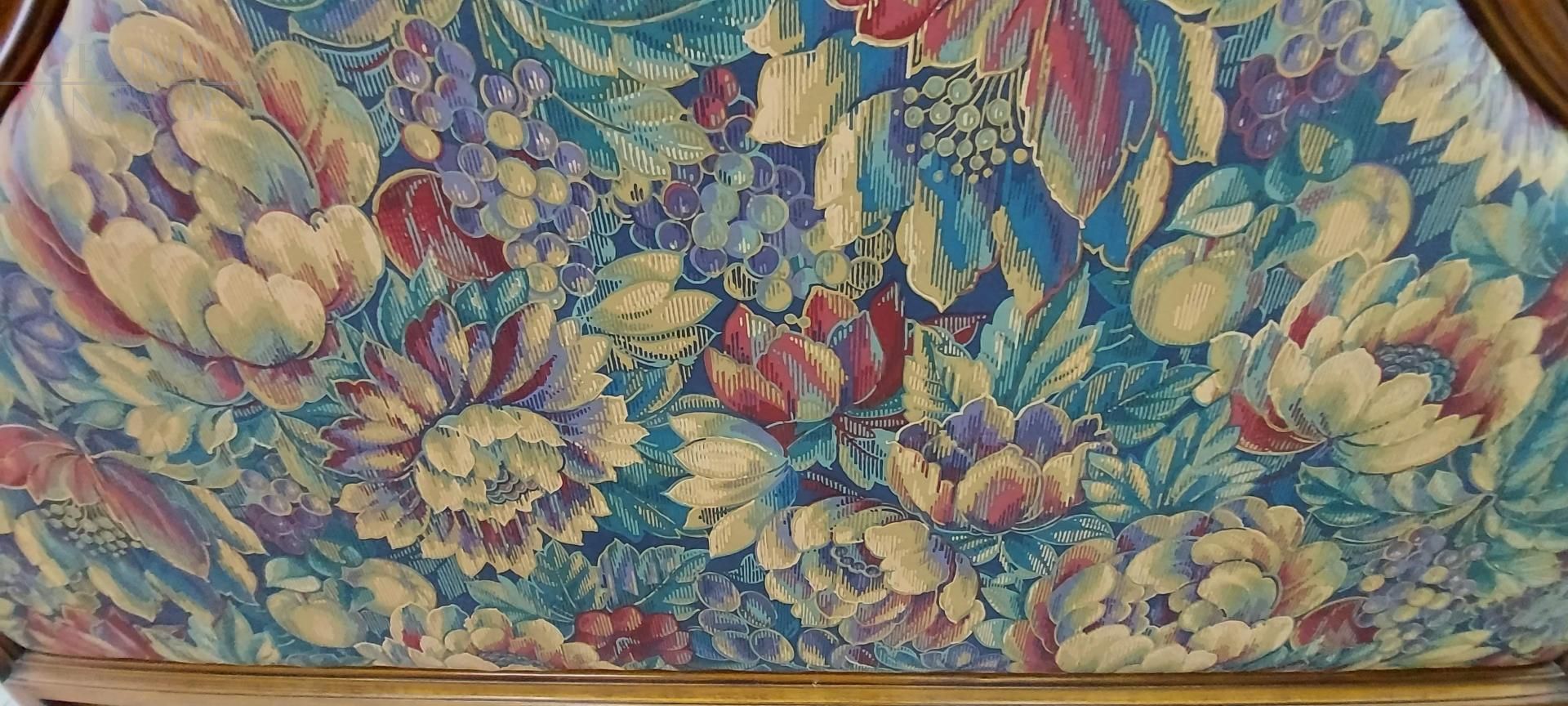 Testata letto vintage imbottita con bellissima stampa floreale, design Provasi, con pediera in noce.