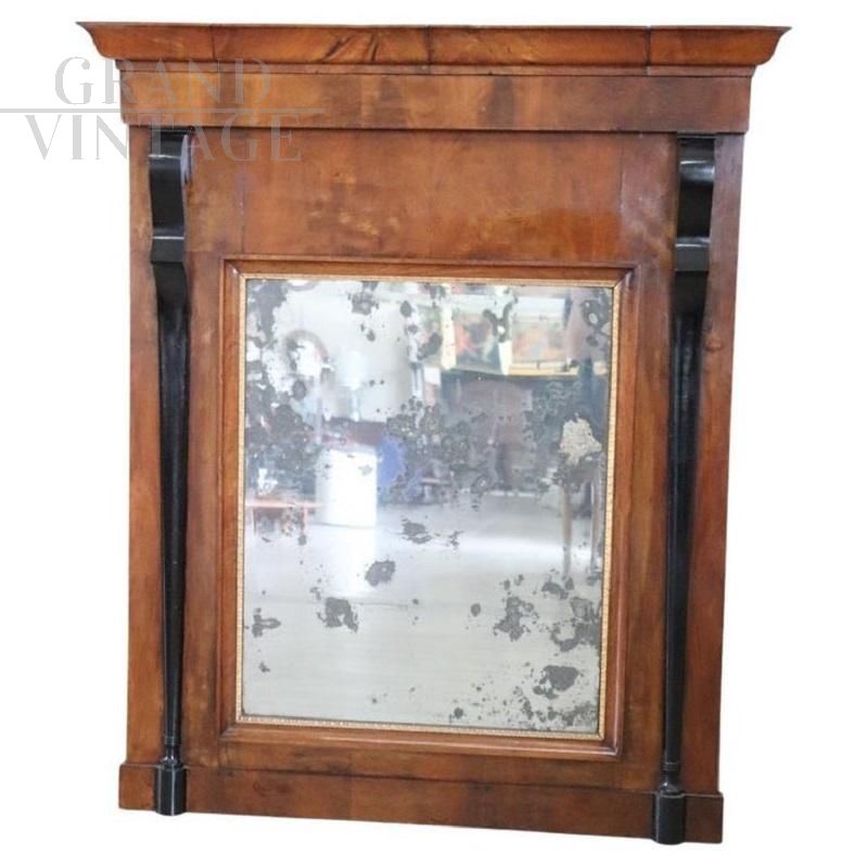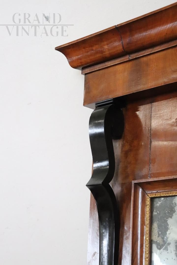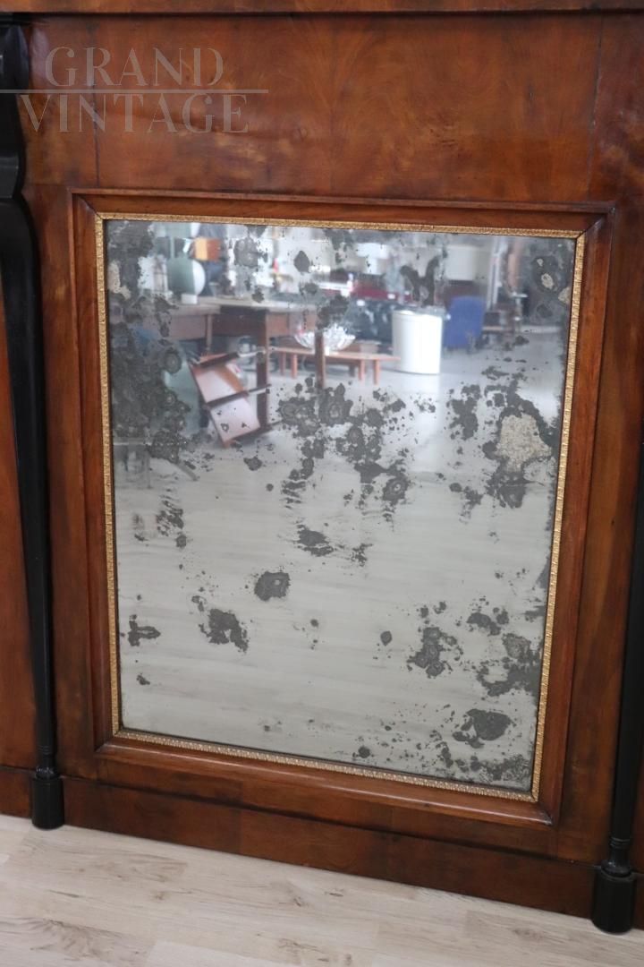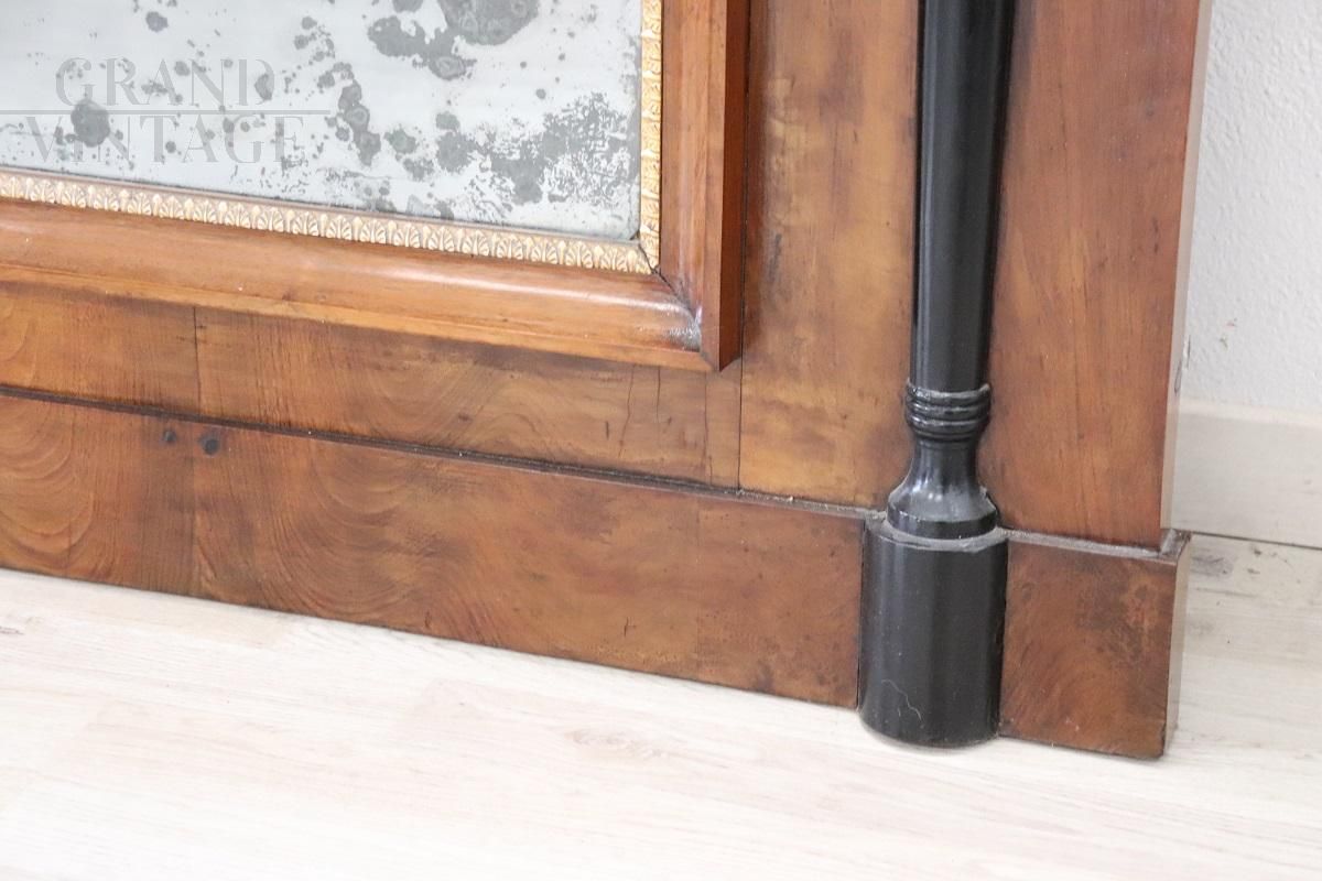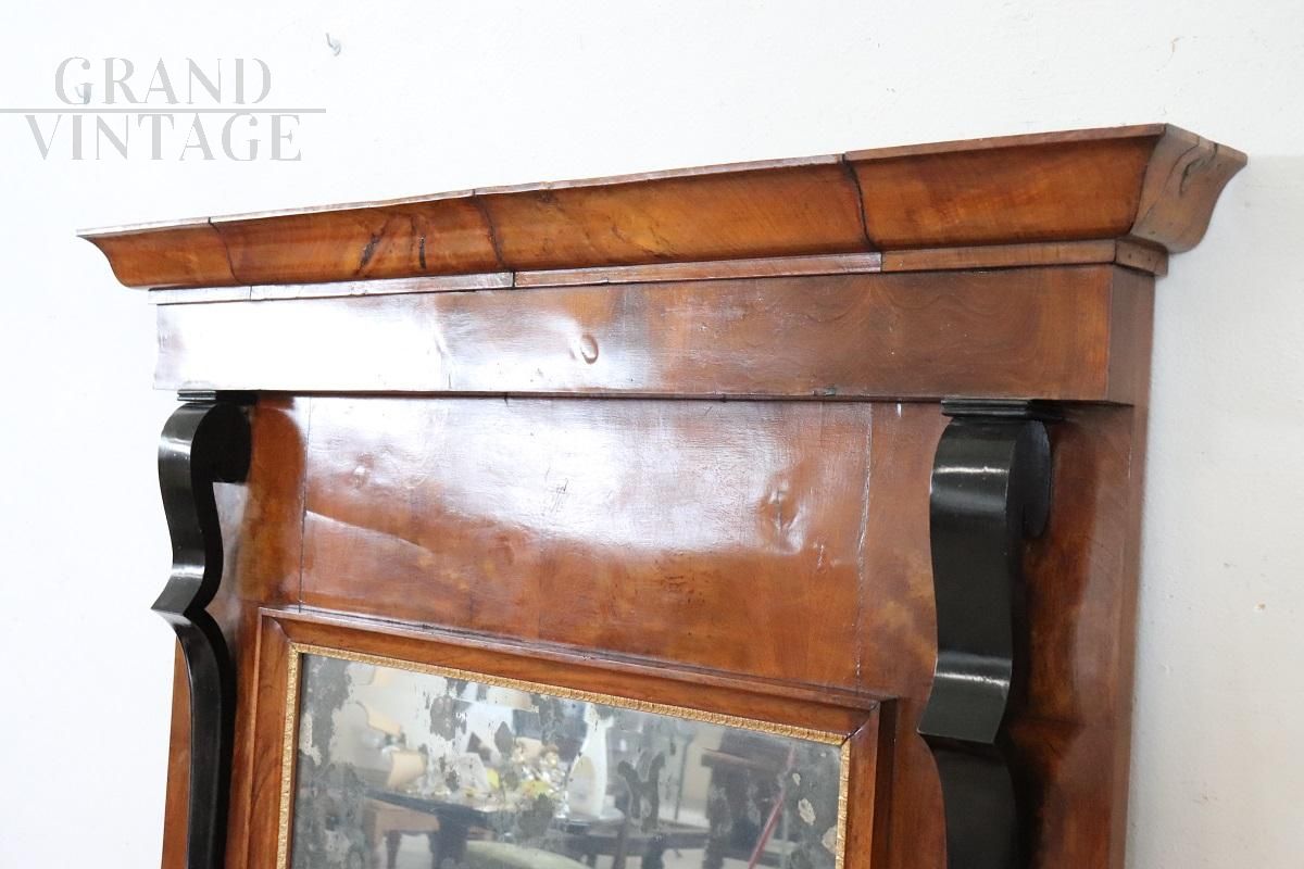 Presentiamo questa elegante specchiera antica italiana risalente ai primi anni del XIX secolo, periodo Impero. Realizzata in pregiato legno di noce e caratterizzata da un'elegante linearità, due maestose lesene laterali decorano il fronte e aggiungono imponenza con il loro colore nero. Una piccola cornice dorata intorno allo specchio conferisce un distinto accento cromatico. Le sue dimensioni sono imponenti, sviluppandosi in altezza questo specchio è stato originariamente progettato per essere collocato sopra un camino. Oggi si può scegliere di collocarlo diversamente ovunque si voglia uno specchio dal sapore antico. Lo specchio è al mercurio antico e presenta tutti i difetti tipici causati dal passare del tempo. Prezzo trattabile.