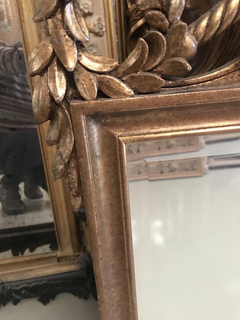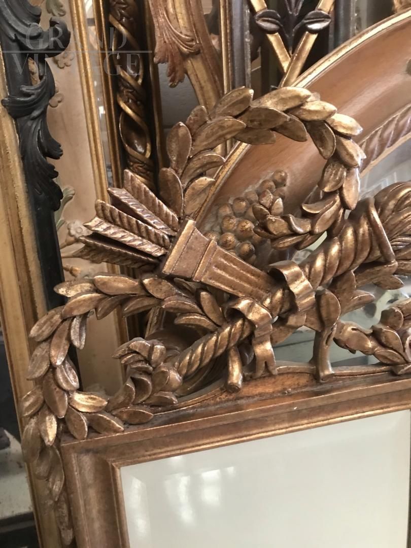 Specchiera in oro stile antico tardo '700, finemente decorata e intagliata con motivi di epoca Impero, faretra e torcia.