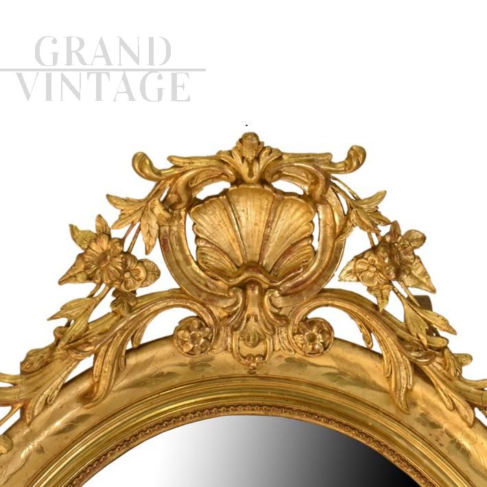 Questa antica specchiera ovale ha una cornice dorata in foglia d’oro zecchino. Lo specchio antico è al mercurio e la cornice che lo veste porta una doppia cimasa, quella superiore parte con una conchiglia per poi scendere con volute e fiori. Si tratta di uno specchio del 1800, XIX secolo, restaurato. Lo specchio e la schiena sono autentici e coevi tra loro. Lo specchio è restaurato a regola d'arte.