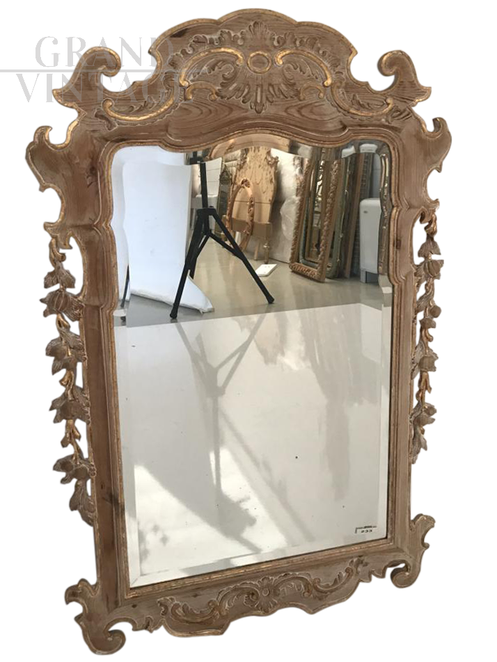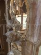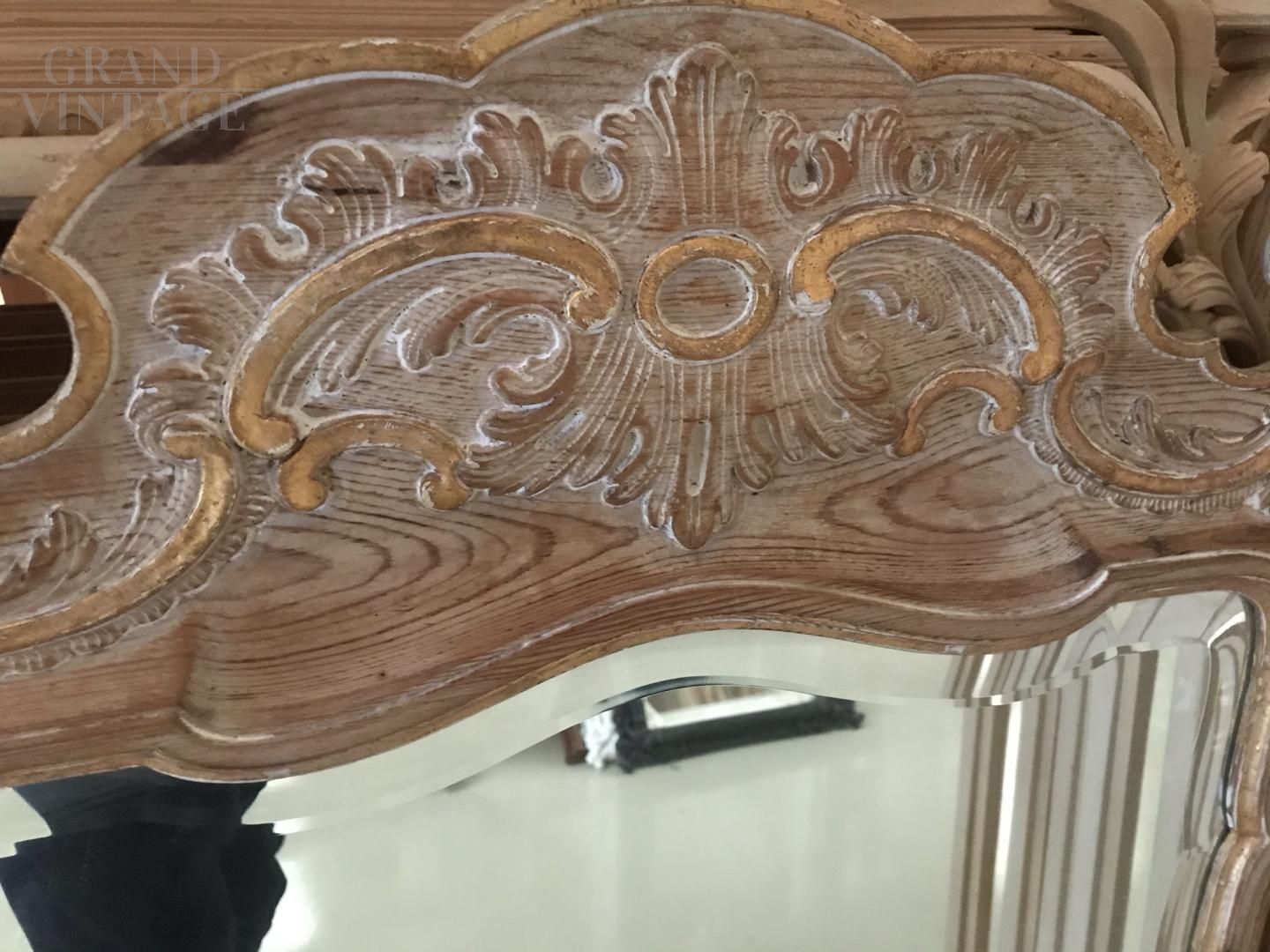 Specchiera recente in stile antico, epoca tardo '800, intagliata a mano in decorazione effetto rinascimento sbiancato / decapato.