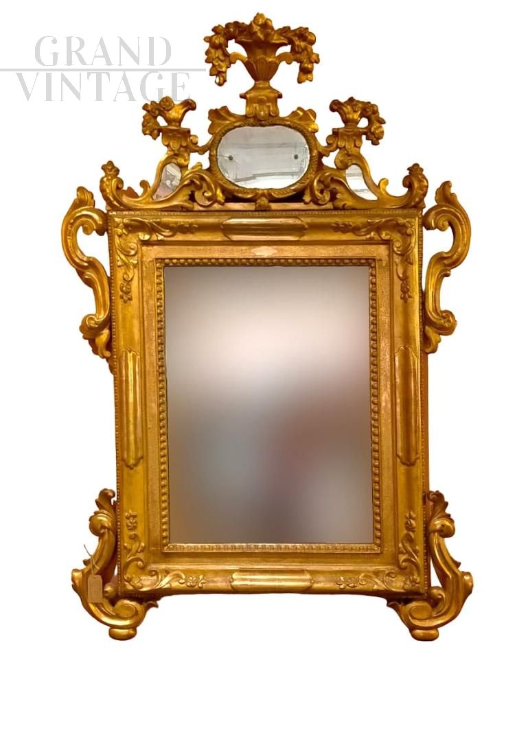 Grande specchiera Luigi XV Veneziana in legno intagliato e dorato con foglia d'oro, con specchio originale al mercurio, decorata da una cimasa intagliata con volute, motivi floreali e piccoli specchi decorativi. Epoca: seconda metà del 1700.
