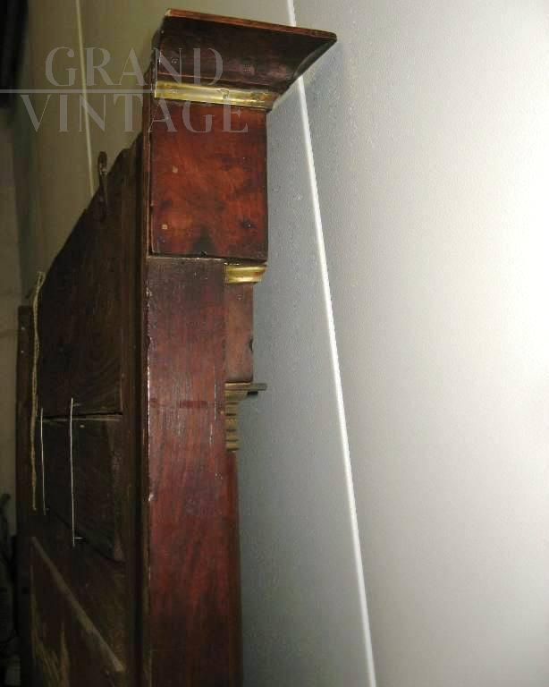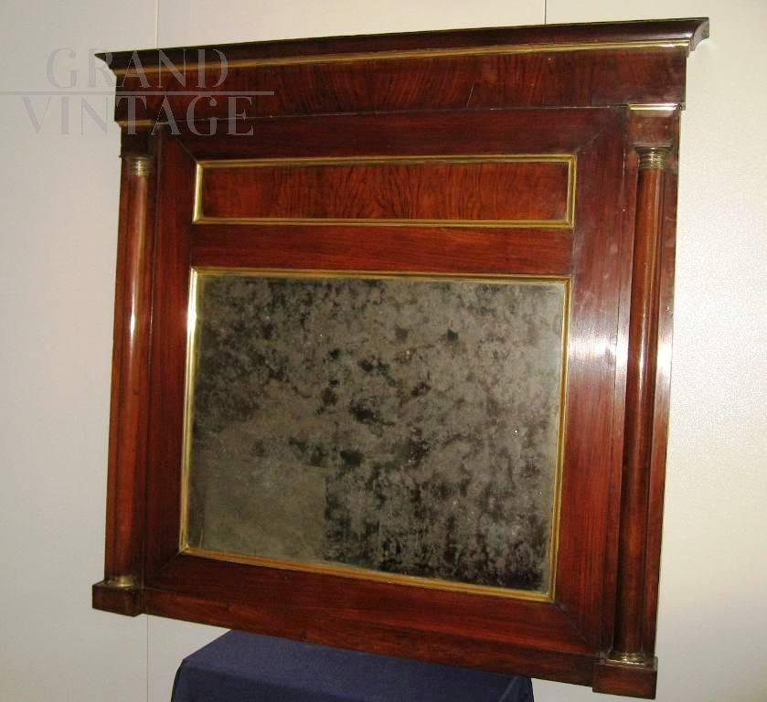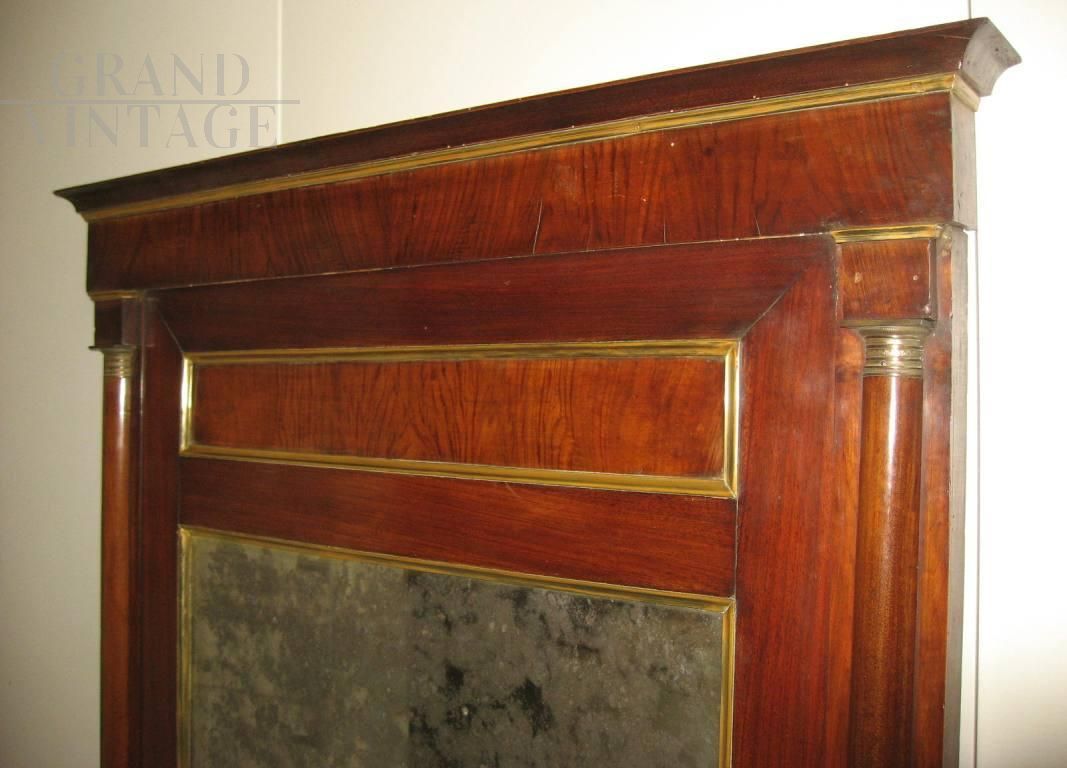 Modello mezza colonna e capitelli in bronzo ai lati, lastronata in noce ed arricchita di cornicette in ottone. Specchio al mercurio molto consumato. Non restaurata recentemente, in ottime condizioni generali.