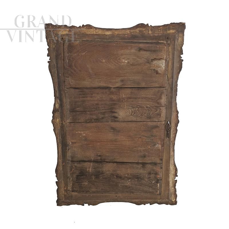 Specchiera in legno in stile antico, dorata e decorata con motivi floreali in rilievo, può essere appesa sia in orizzontale che in verticale.