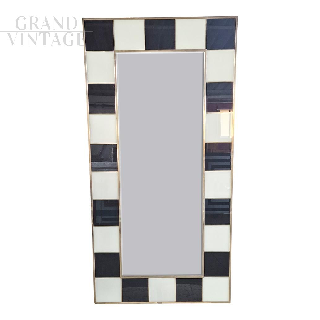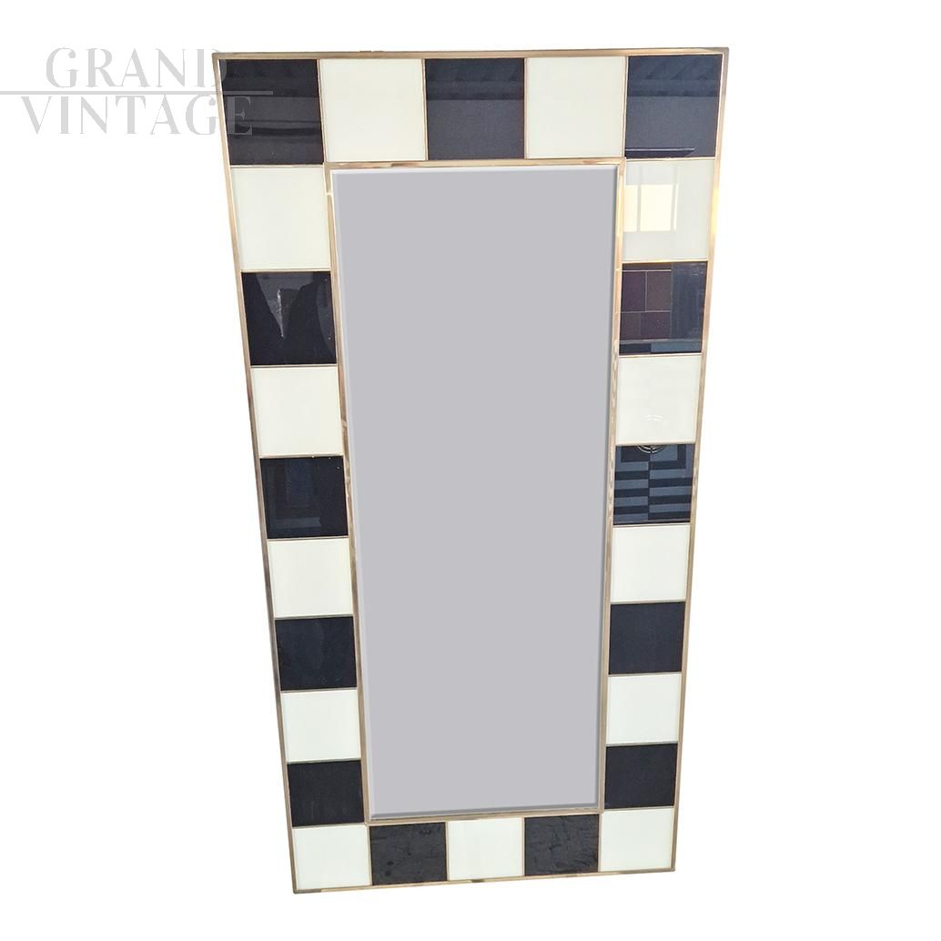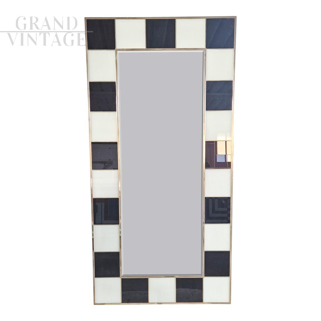 Grande specchiera con struttura in legno e finiture superficiali in tessere di vetro bianco e nero, retroilluminata, interamente realizzata a mano, con profili in ottone dorato.