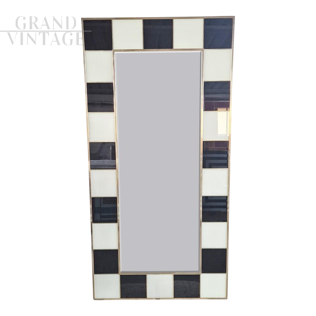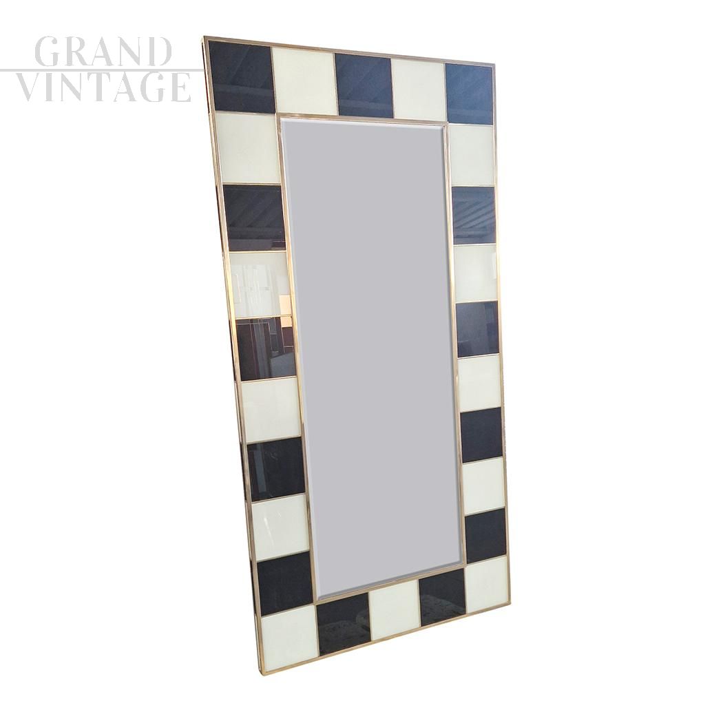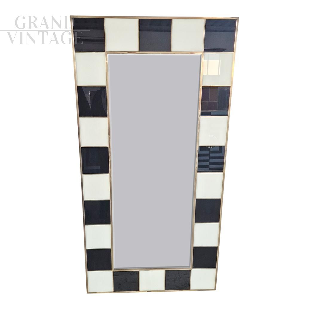 Grande specchiera con struttura in legno e finiture superficiali in tessere di vetro bianco e nero, retroilluminata, interamente realizzata a mano, con profili in ottone dorato.
