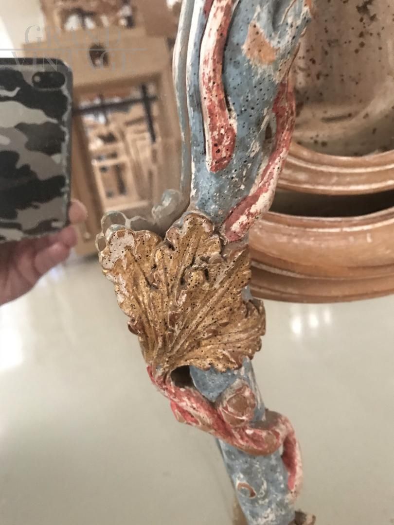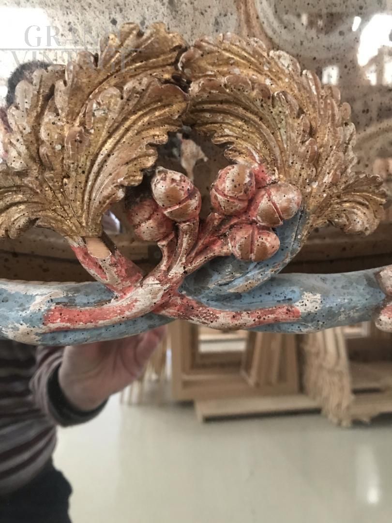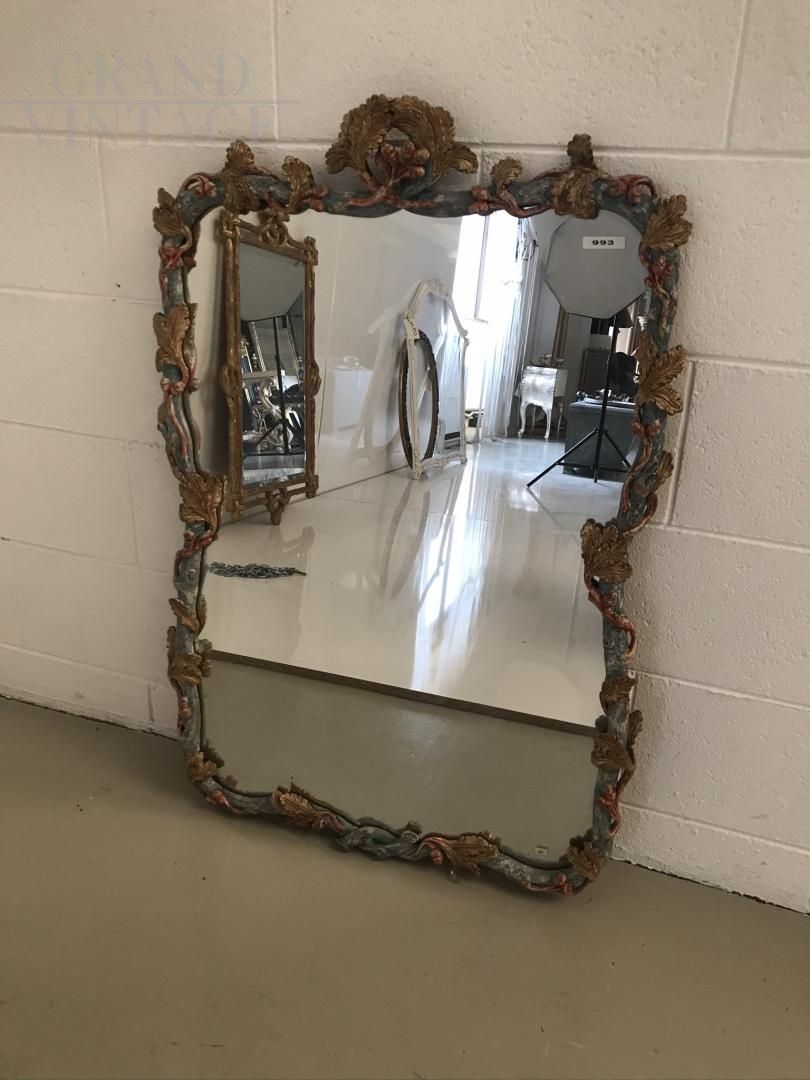 Specchiera intagliata a mano in stile antico e dipinta con colori policromi pastello