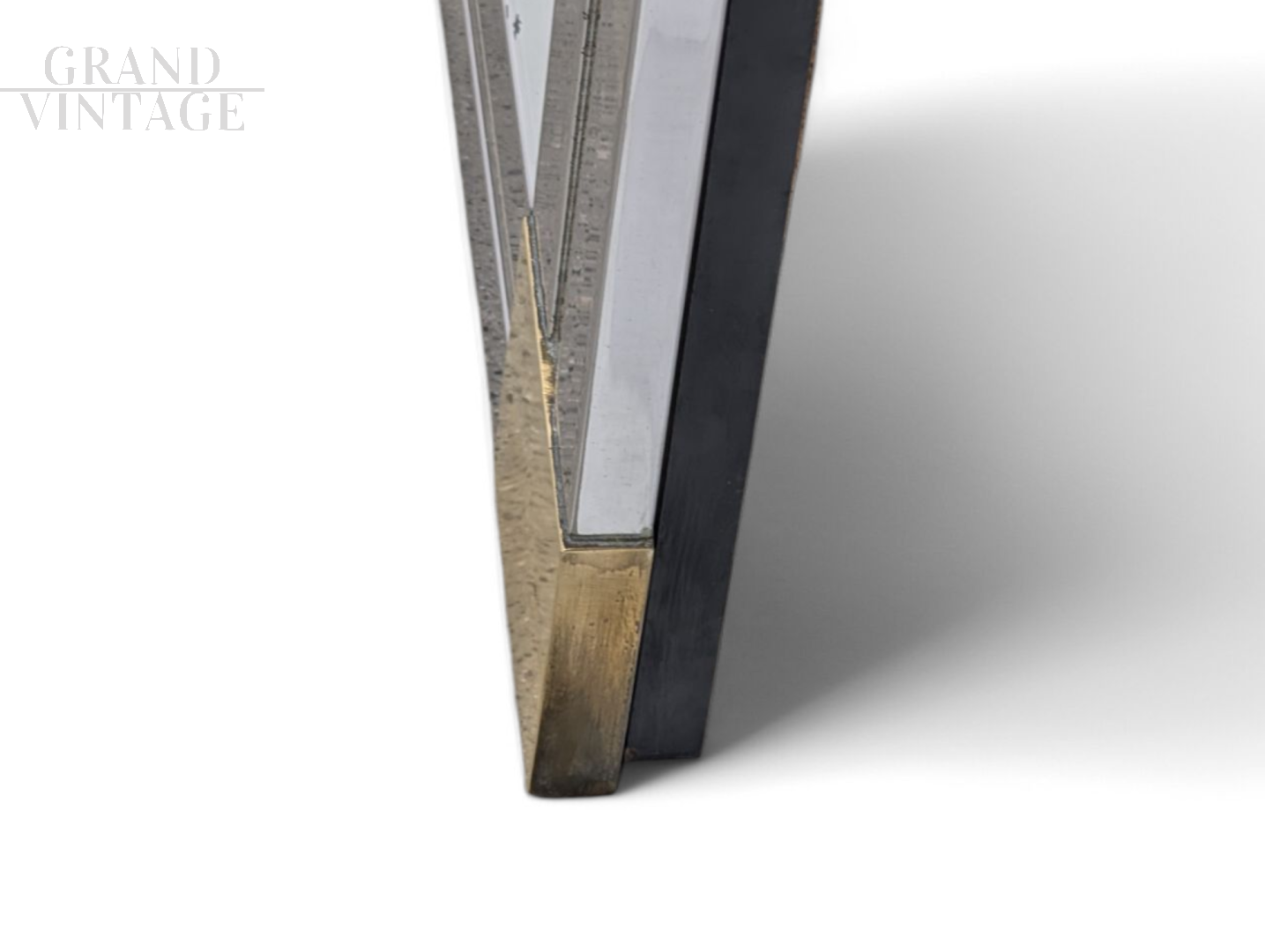 Grande specchiera da parete a figura intera con cornice cromata con decoro geometrico in ottone, Italia anni '70, in condizioni ottime, leggeri segni del tempo.