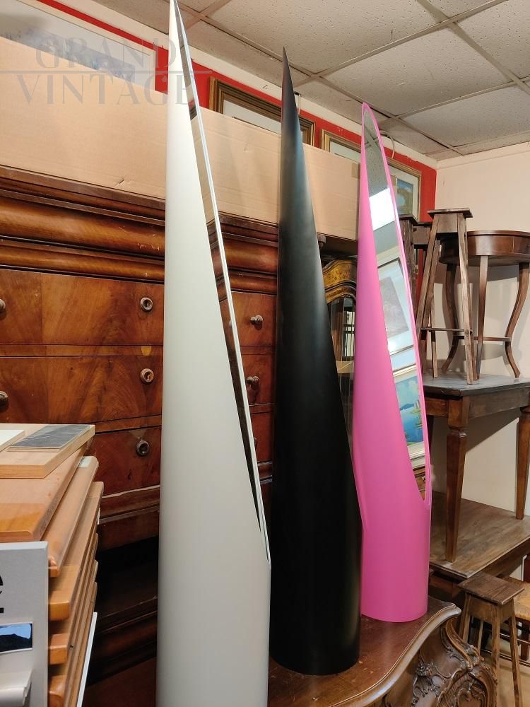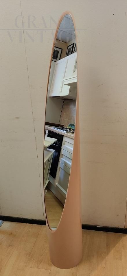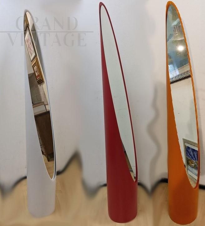Specchio a colonna modello unghia di recente produzione, ispirato al design dell'architetto Rodolfo Bonetto dell'Italia degli anni '70. Questo modello ha una Struttura tubolare in PVC con inserto in vetro specchio ellittico. Disponibili diversi colori, come da foto. Chiamaci al numero +39 02 50041205 o scrivici alla mail info@grandvintage.com per scegliere il colore.