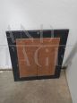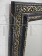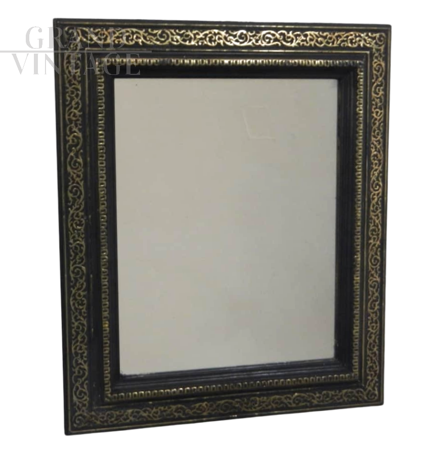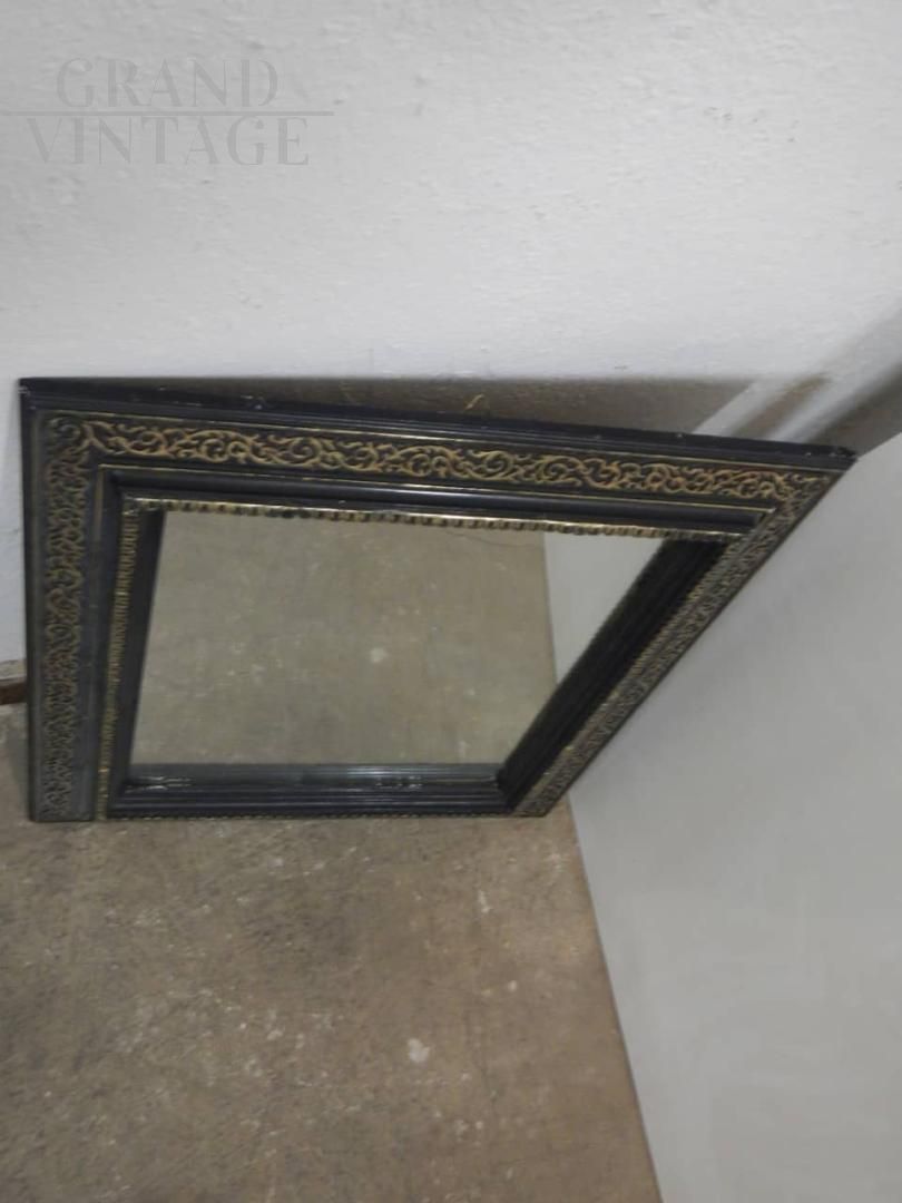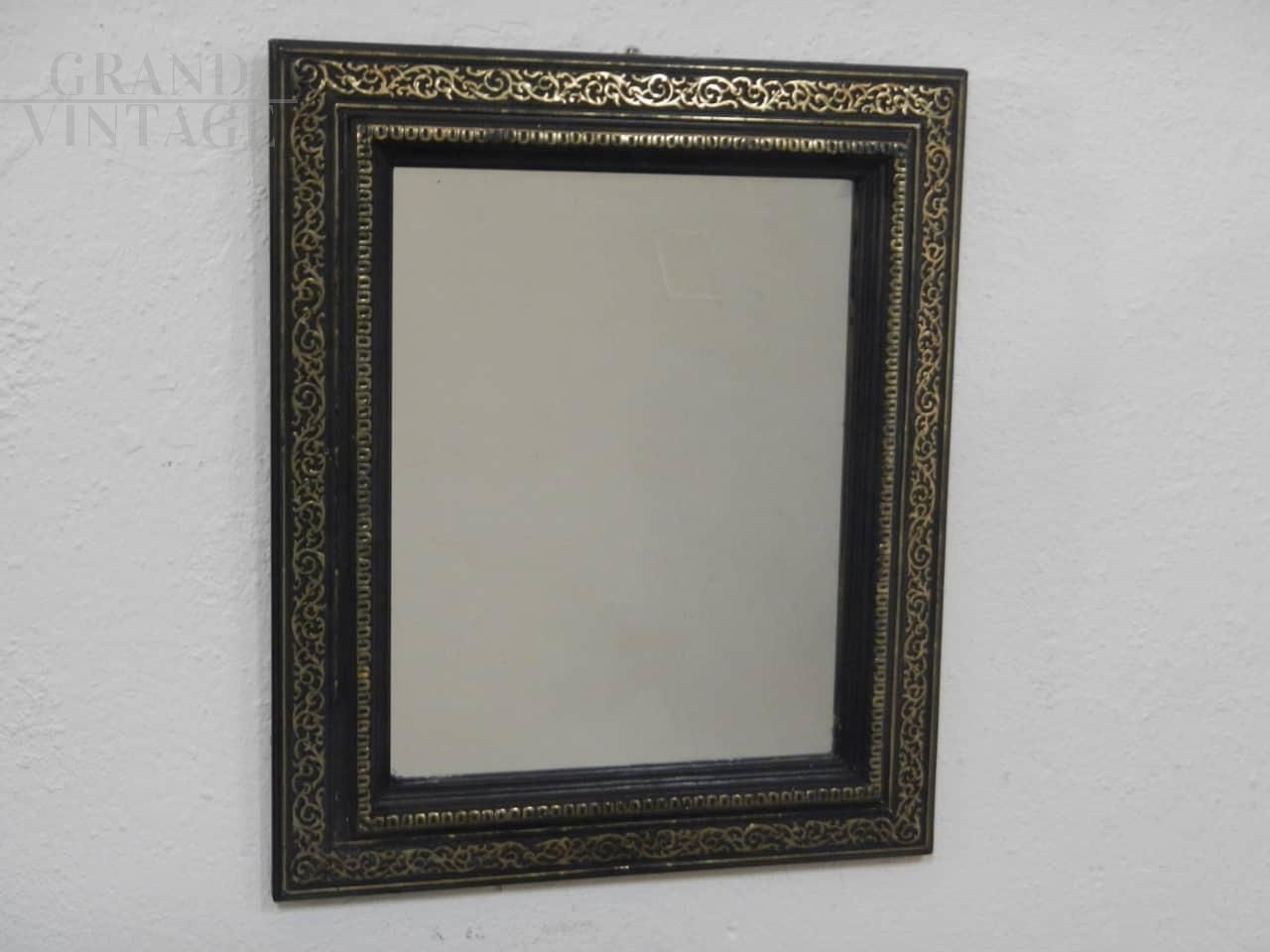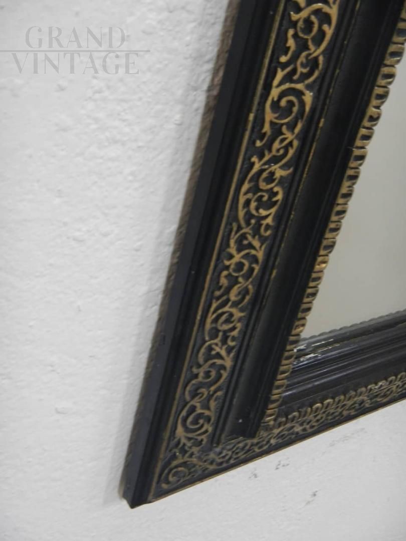 Specchio vintage anni '20 con cornice intagliata in legno di tiglio laccato nero con decorazioni dorate, in buone condizioni, in patina originale.