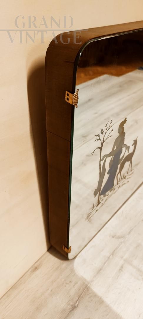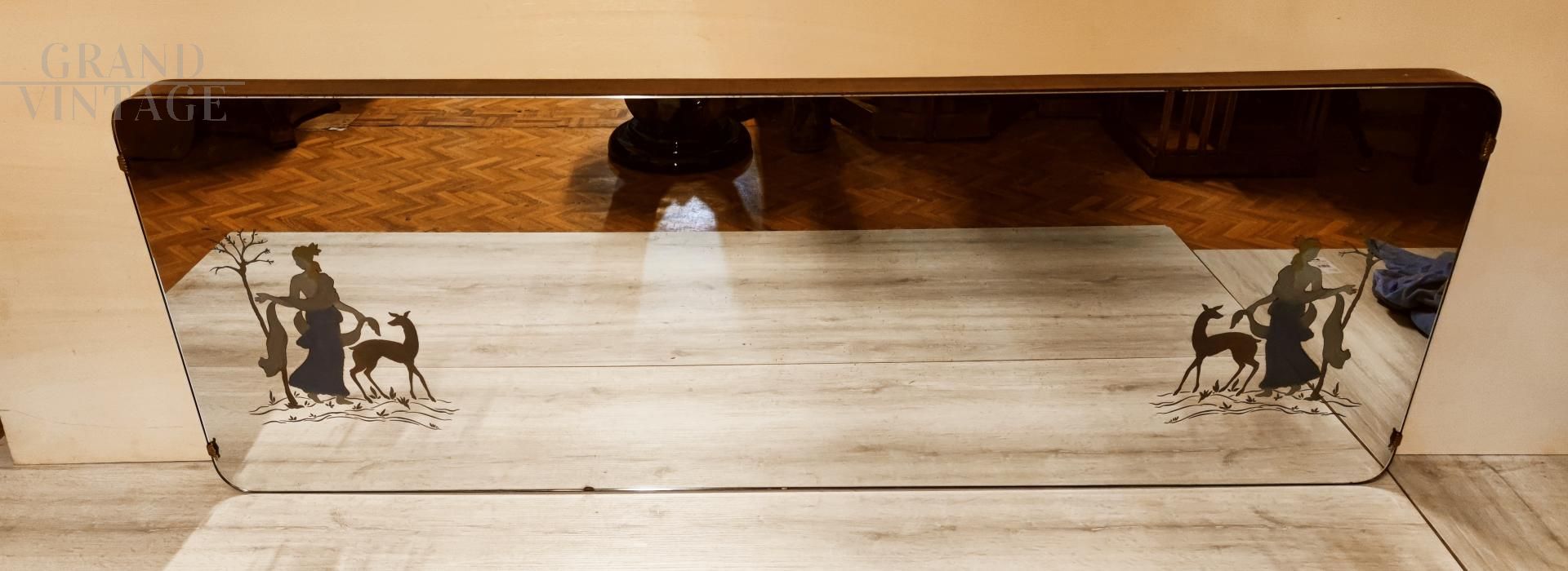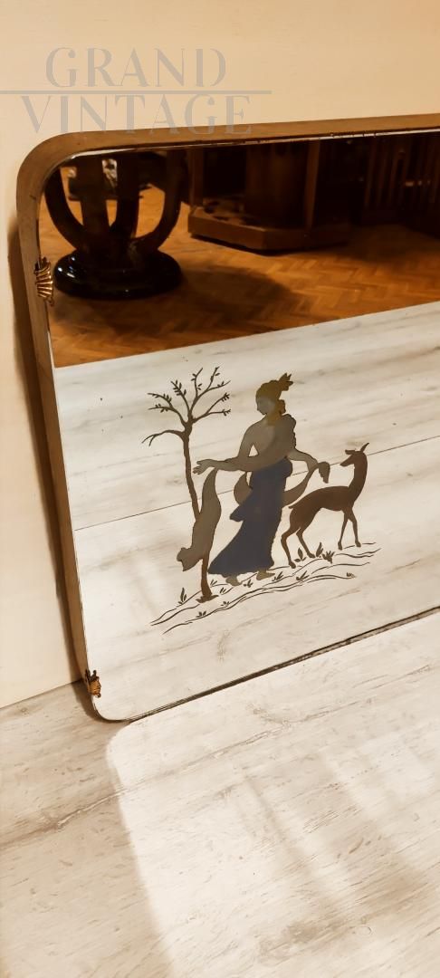 Bella specchiera Art Déco anni '30 con vetro inciso serigrafato con un paesaggio con donna e cervo.