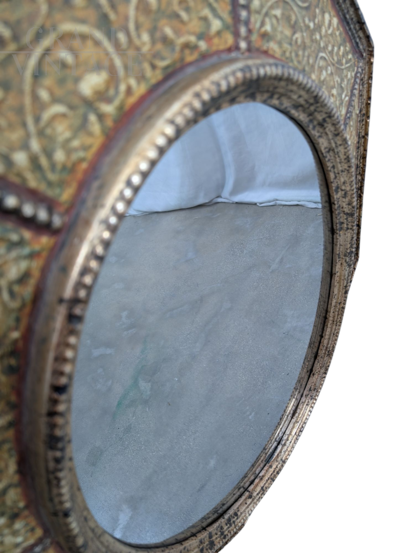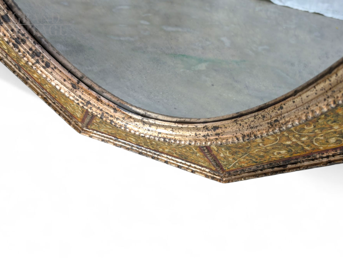 Bellissimo specchio classico in stile barocco veneziano con una importante cornice ottagonale in legno intagliato, in buone condizioni, la parte in legno presenta i naturali segni del tempo, la parte specchiante riflette con un incantevole effetto antico.
