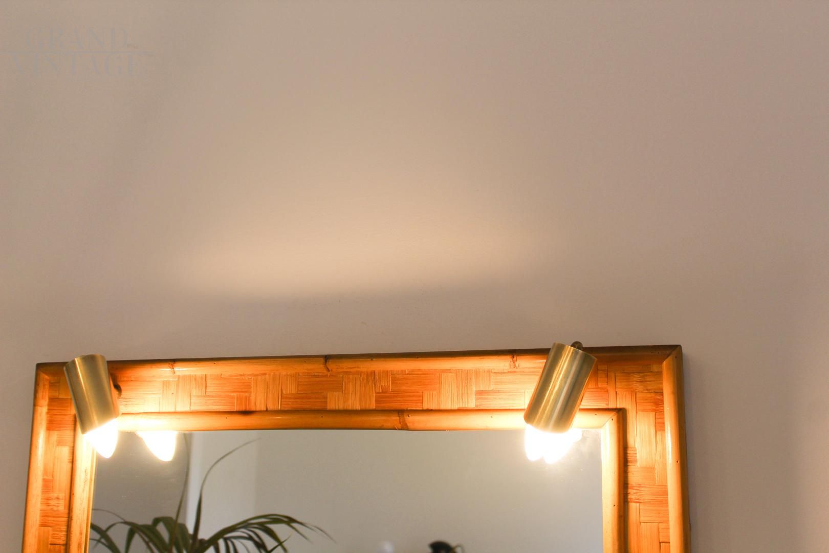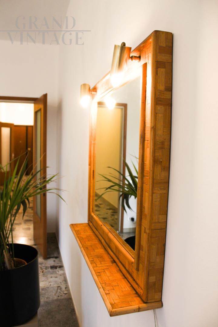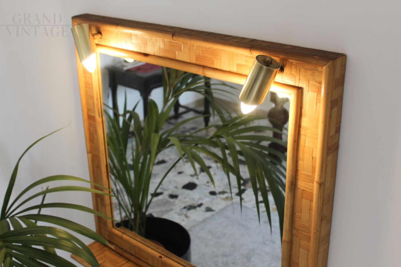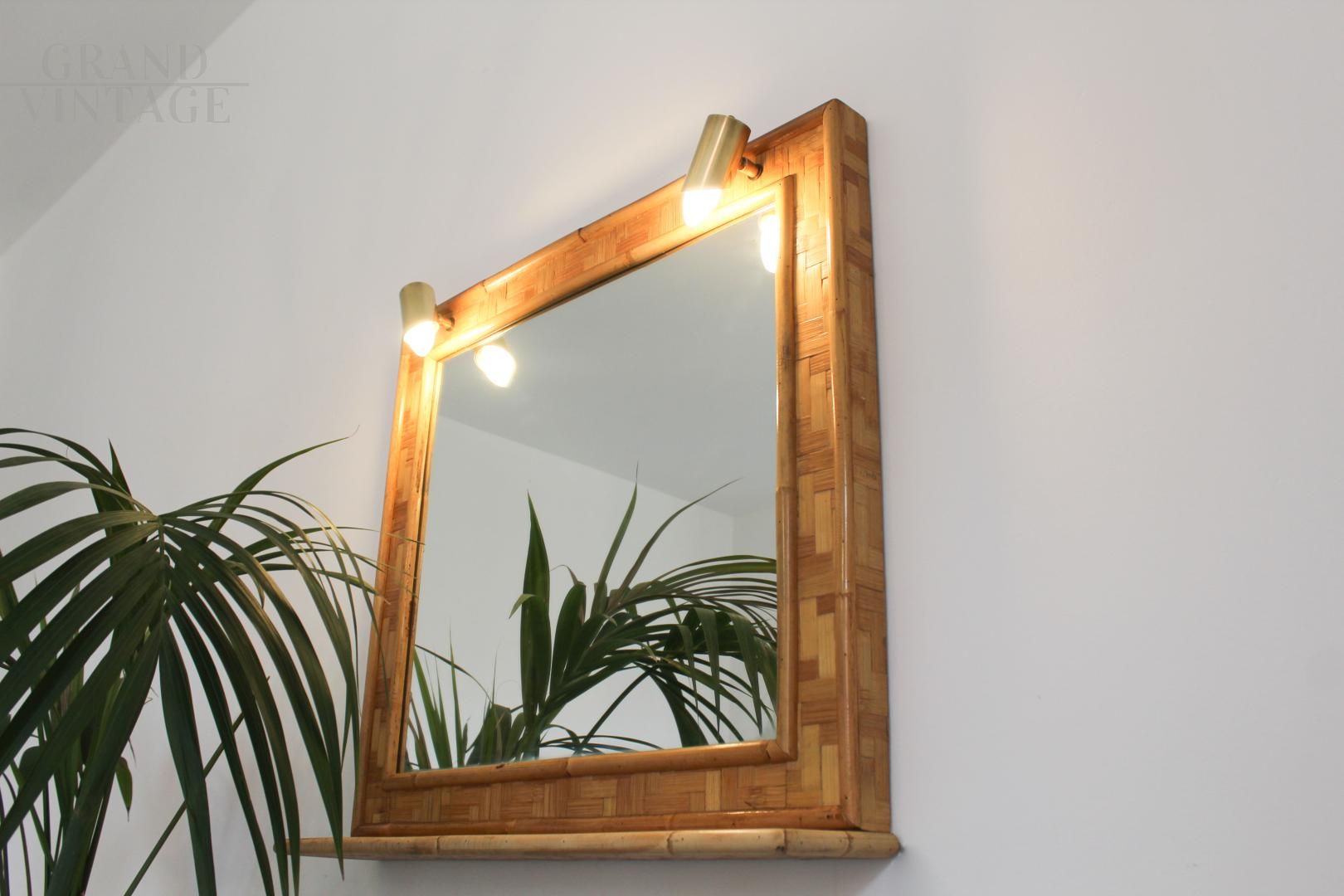 Specchio vintage in bambù e ottone, Italia anni '70, dotato di mensola e impianto di illuminazione composto da due punti luce. Design pulito ed elegante.