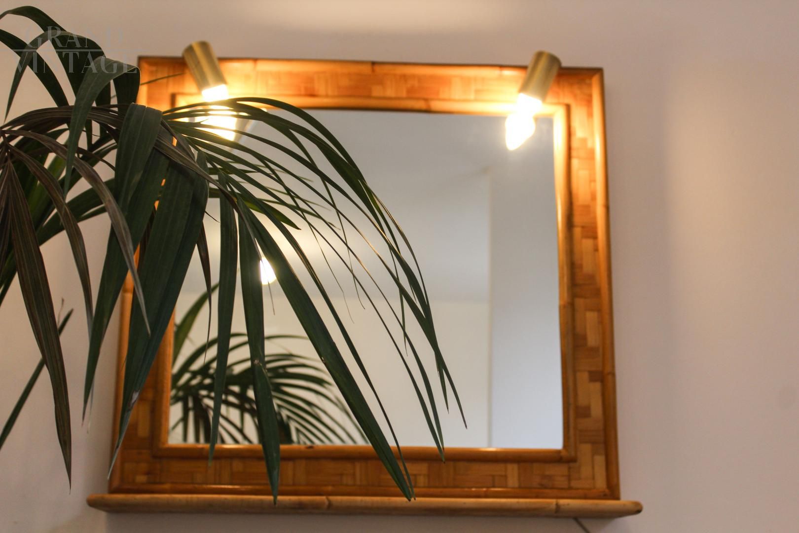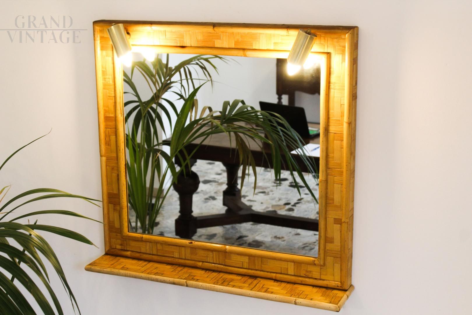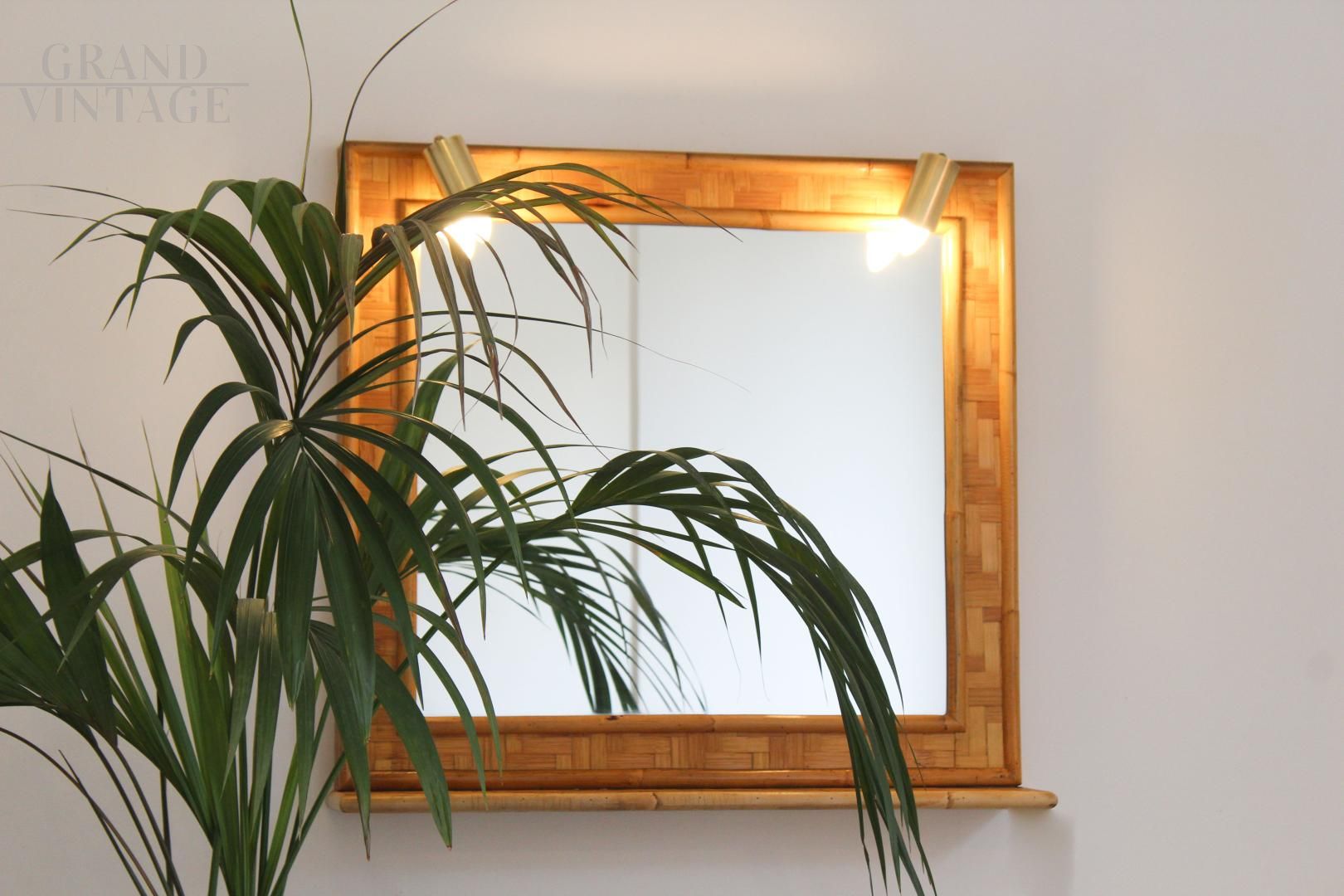 Specchio vintage in bambù e ottone, Italia anni '70, dotato di mensola e impianto di illuminazione composto da due punti luce. Design pulito ed elegante.