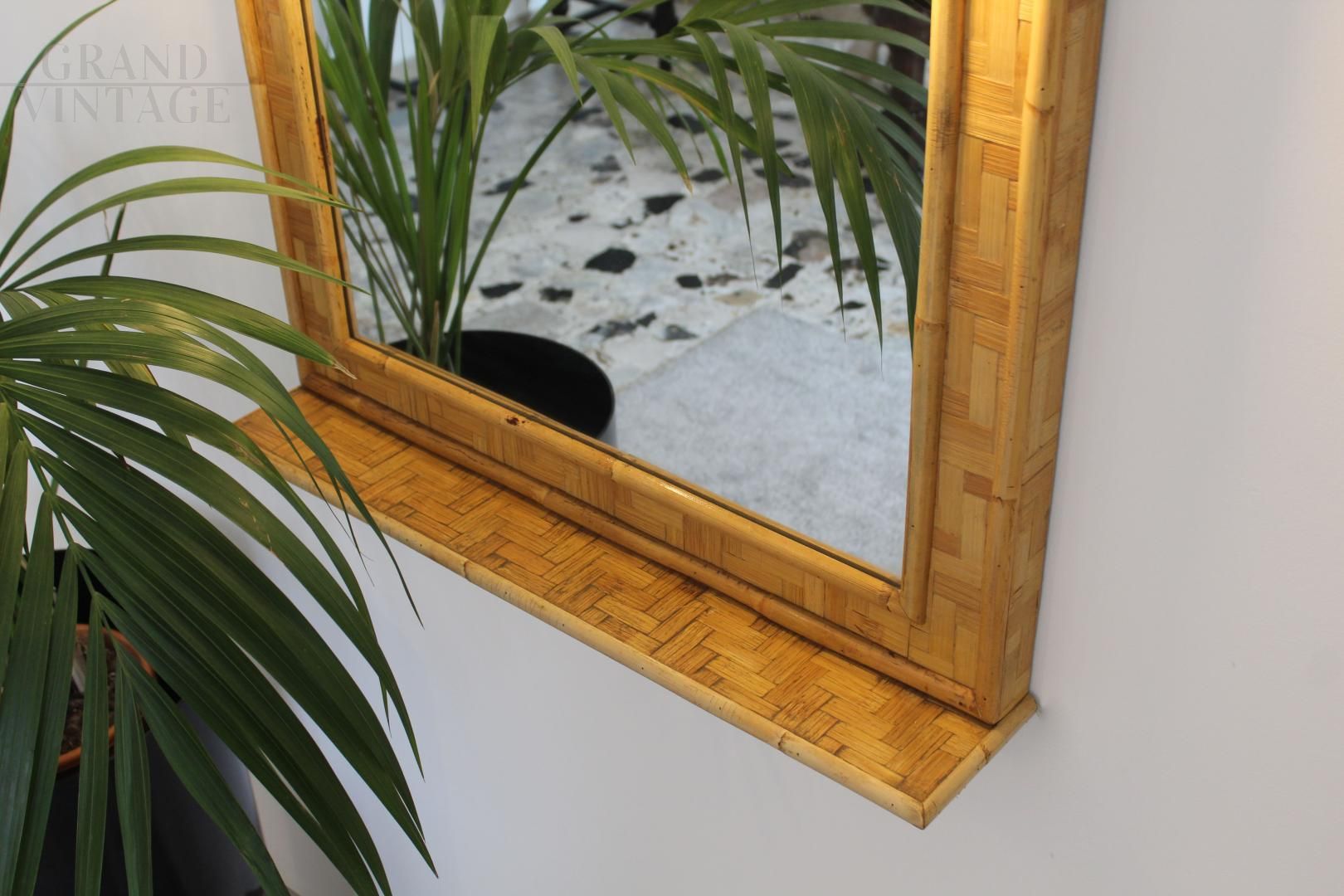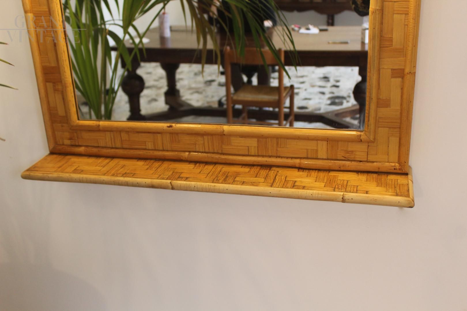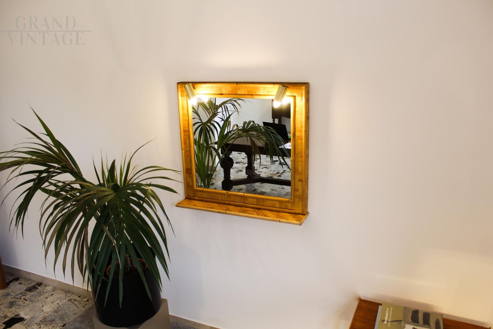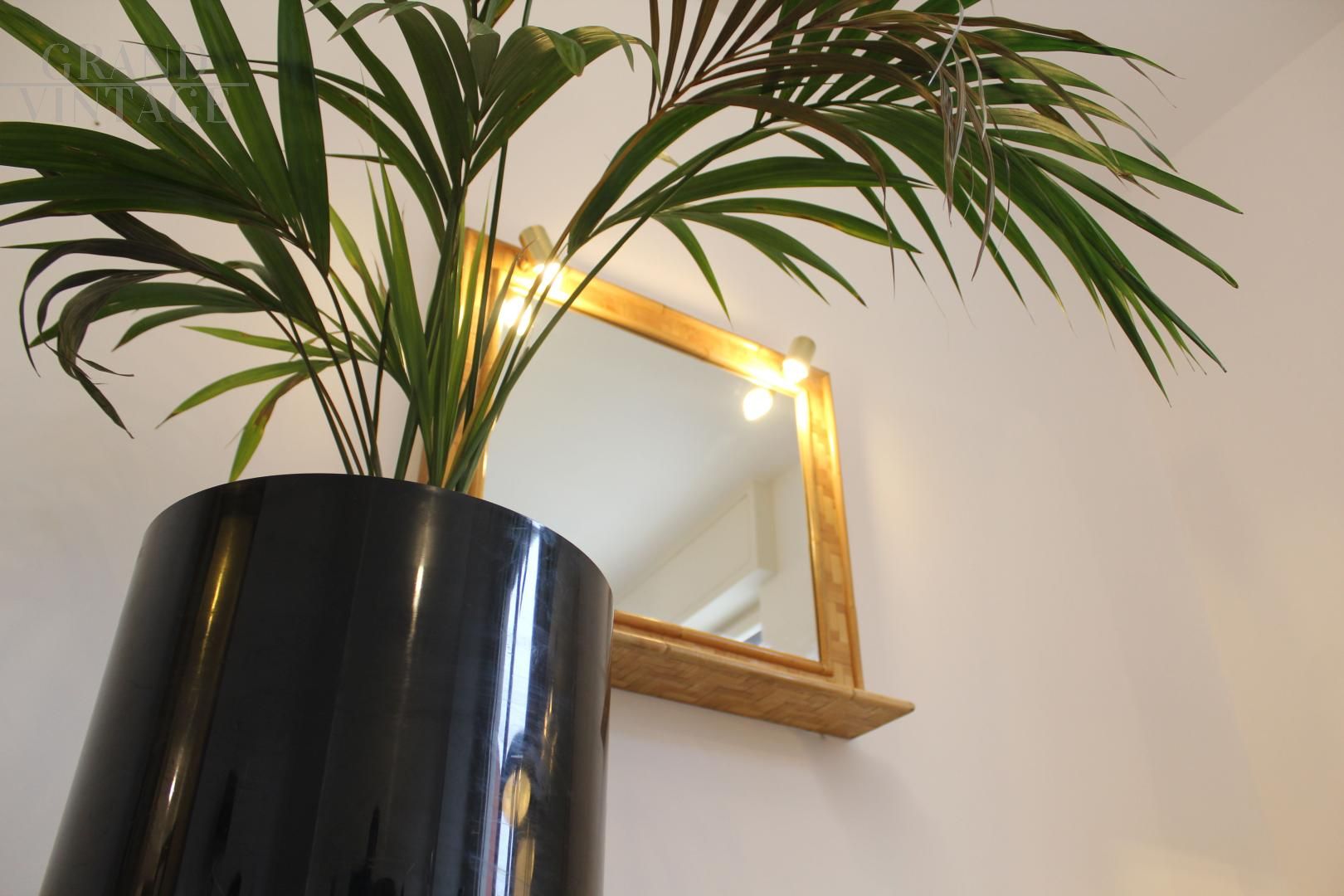 Specchio vintage in bambù e ottone, Italia anni '70, dotato di mensola e impianto di illuminazione composto da due punti luce. Design pulito ed elegante.