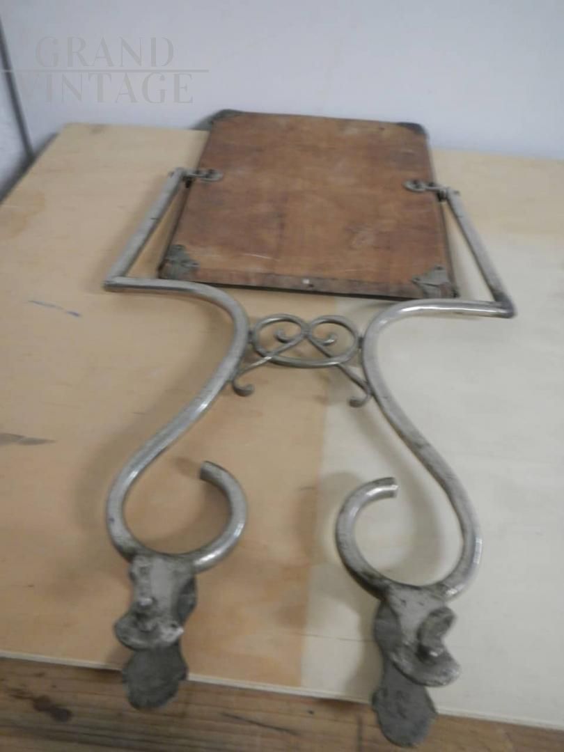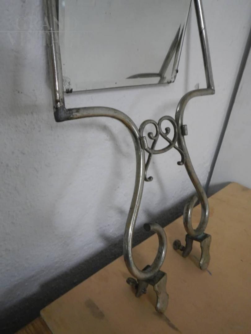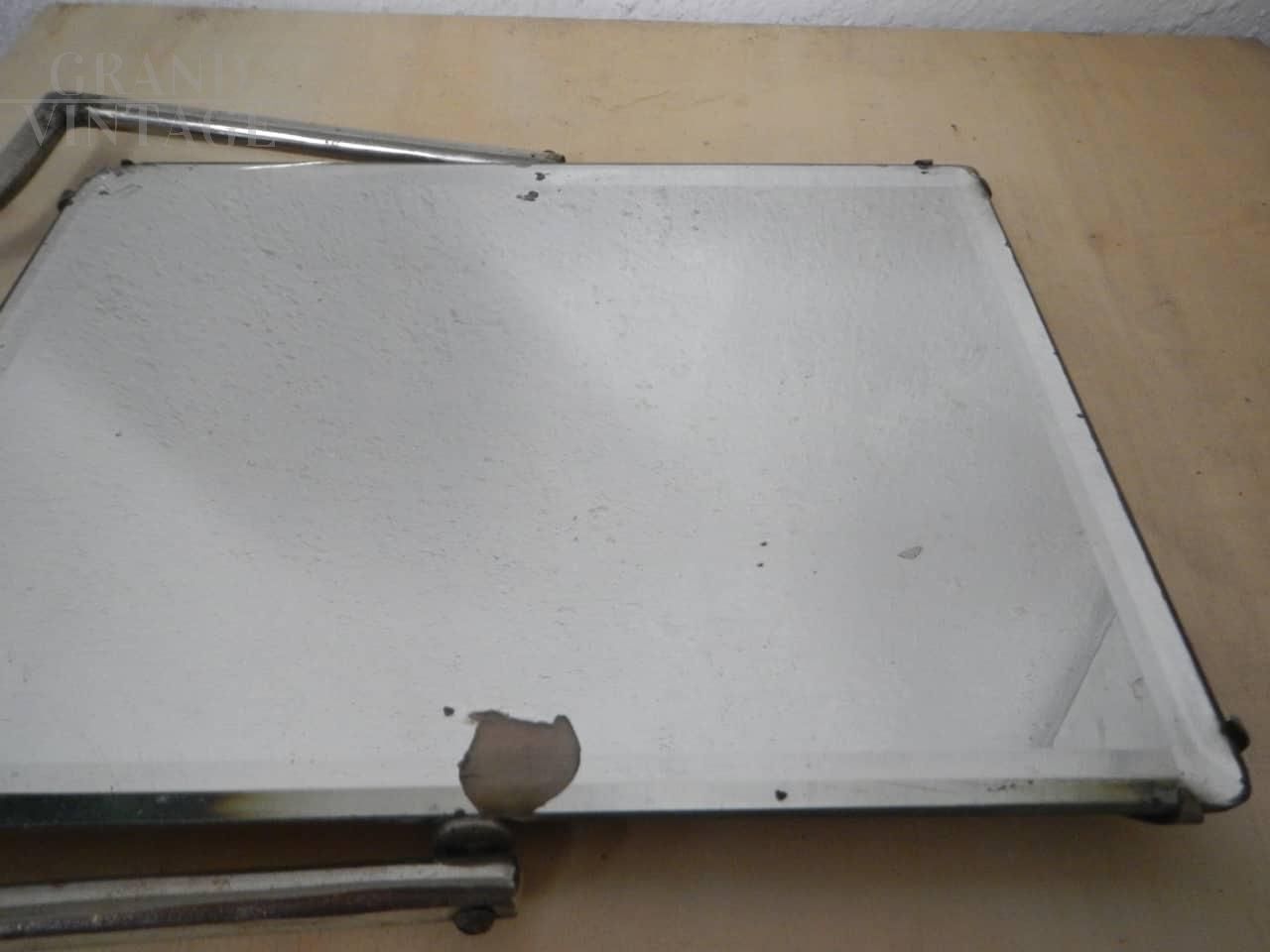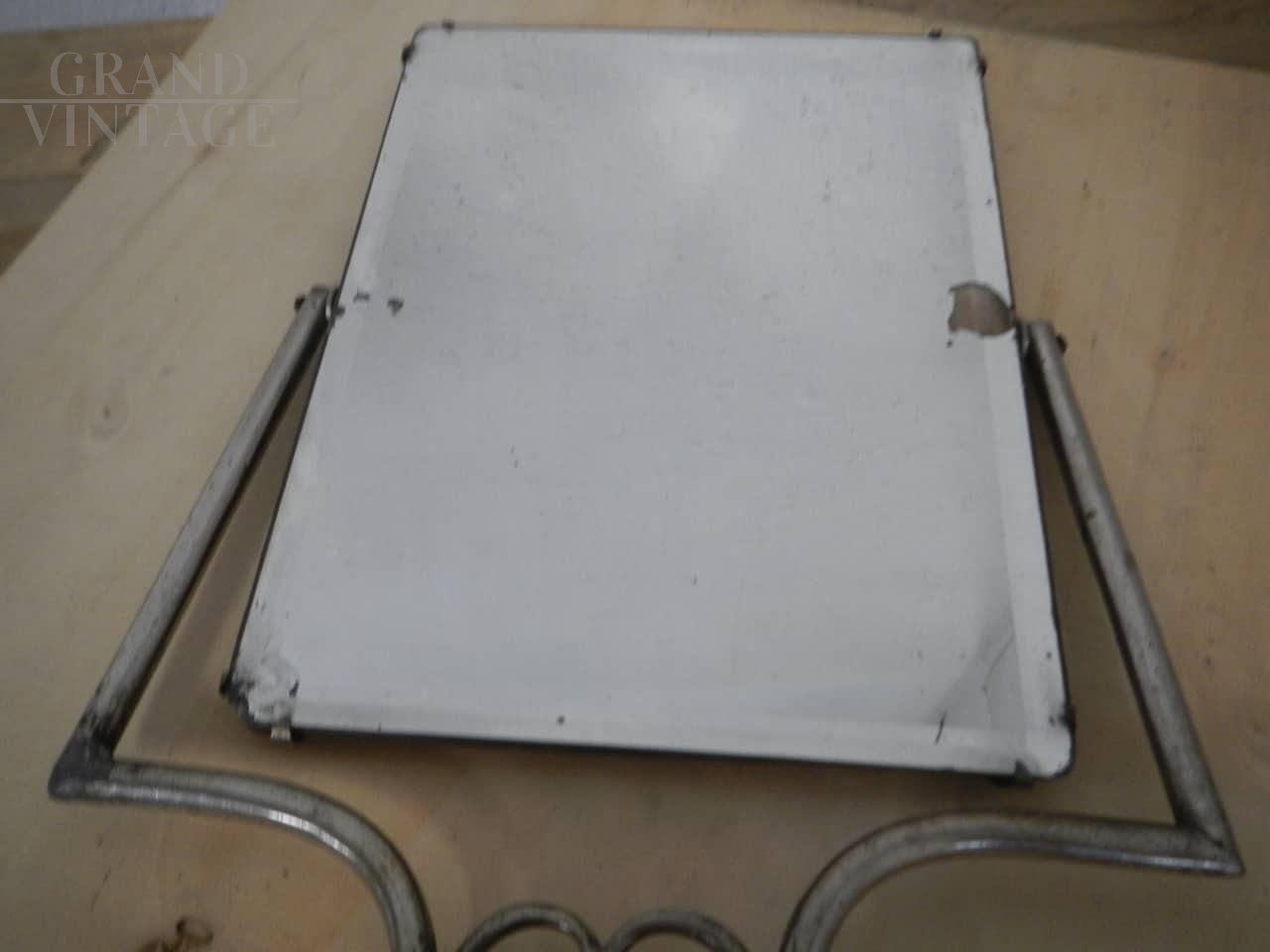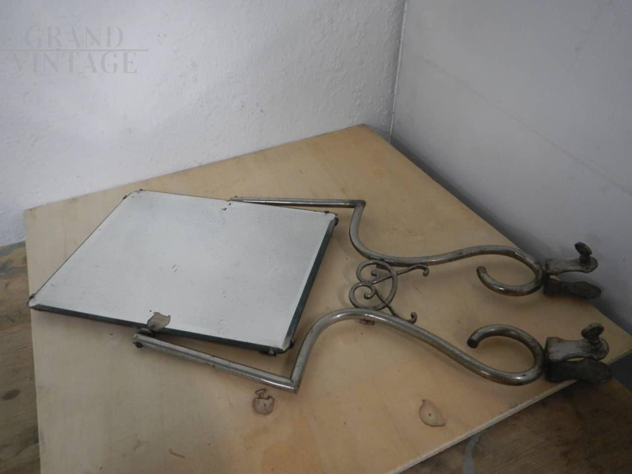 Specchio vintage anni '40 con con supporto in metallo cromato, completo di ganci a morsetto per fissarlo ad un supporto. Lo specchio senza struttura misura cm 21 x1.5 cm, altezza 27 cm. Segni d’uso evidenti.