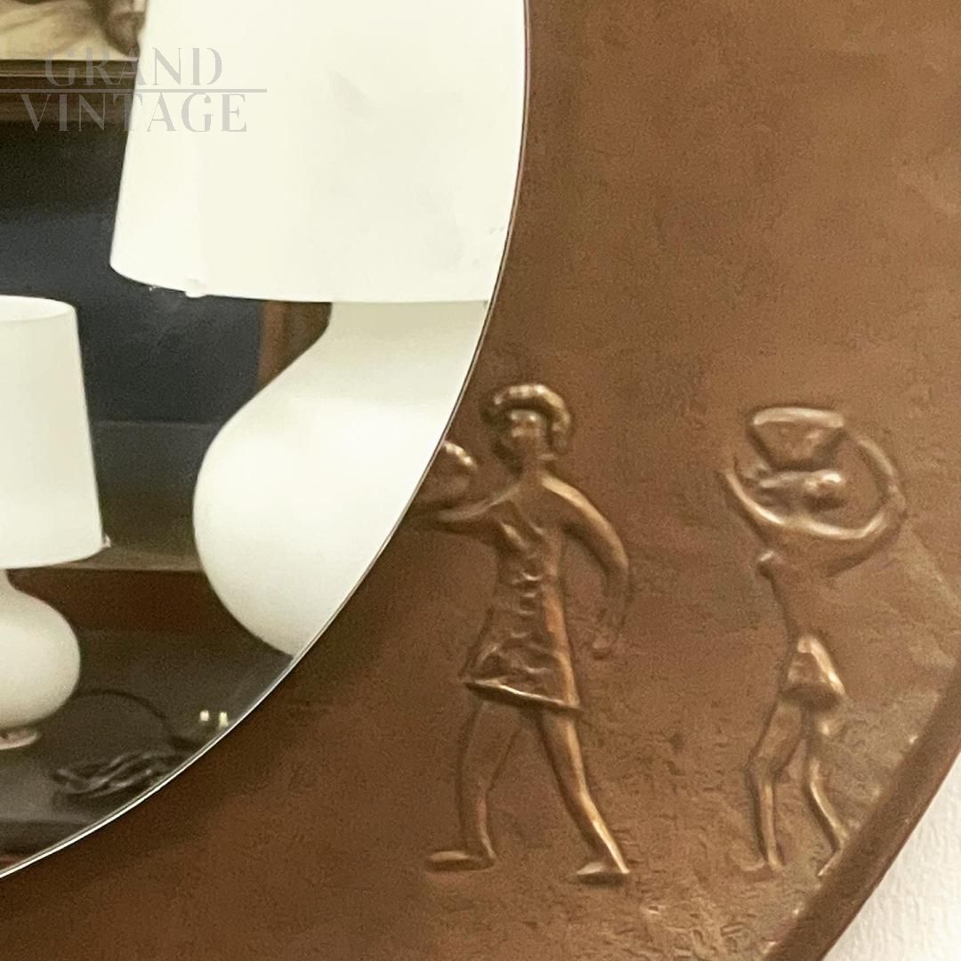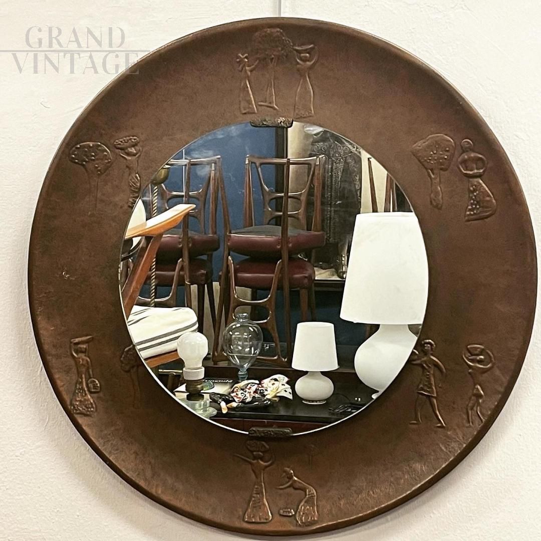 Specchio rotondo di Angelo Bragalini in rame lavorato a sbalzo con figure umane, con sostengni del vetro in bronzo. Italia anni '70.