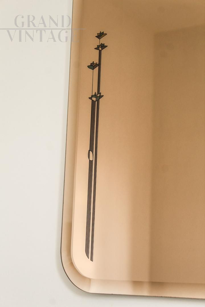 Specchio vintage bisellato in vetro fumé, Italia anni '50, con decori a motivi floreali liberty.