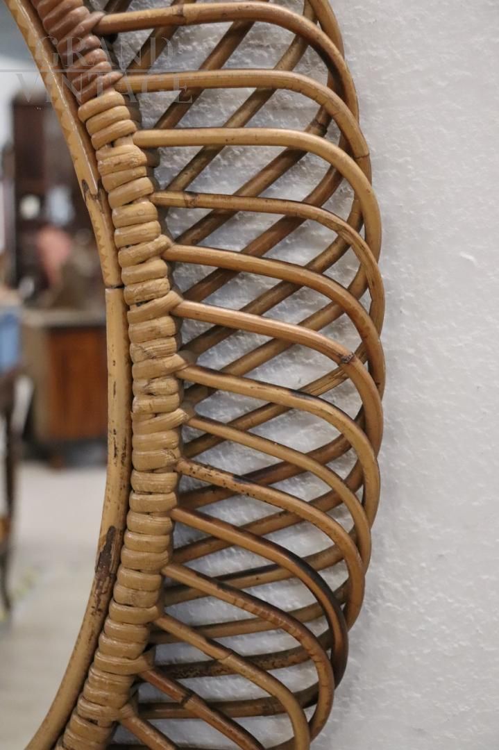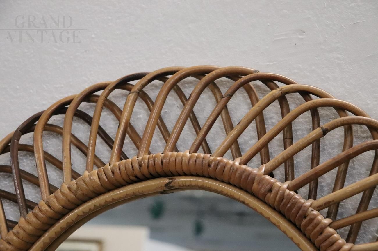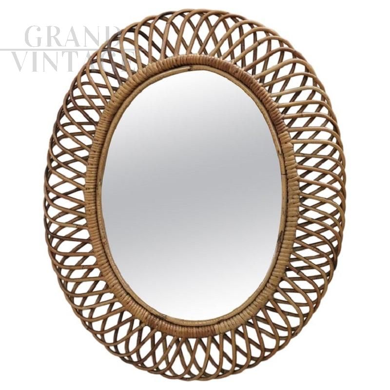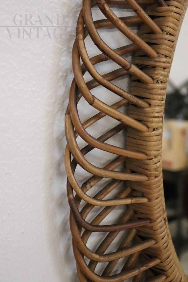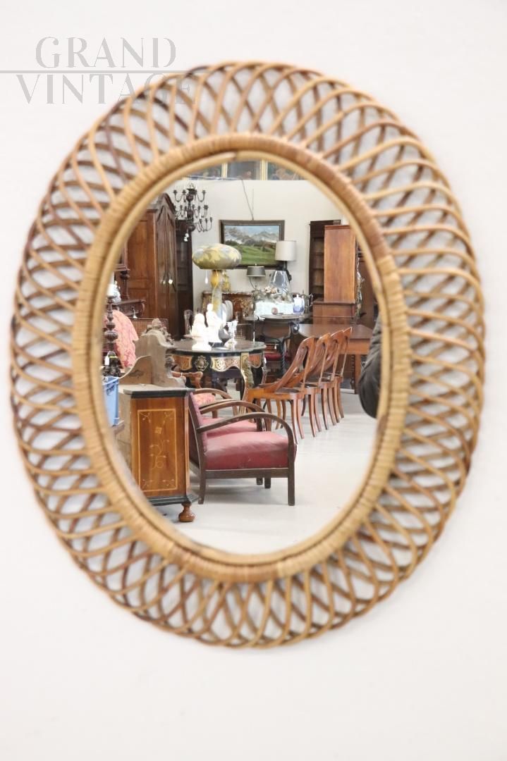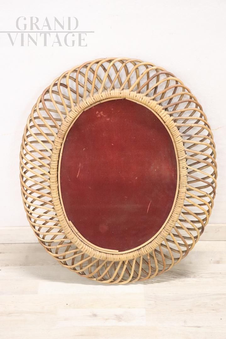 Questo specchio rappresenta una splendida testimonianza dell'artigianato di metà secolo. Ogni dettaglio è stato realizzato a mano con precisione, dando vita a un affascinante specchio decorativo che vanta proporzioni perfette. La cornice ovale è ornata da raffinati motivi di bambù curvo e rattan intrecciato a mano, che creano un effetto di leggerezza e dinamismo. Il retro dello specchio è rifinito con un ricco velluto rosso, un tocco di lusso! La patina naturale uniforme ha conferito al bambù una calda tonalità ambrata, simile al miele. In perfette condizioni, prezzo trattabile.