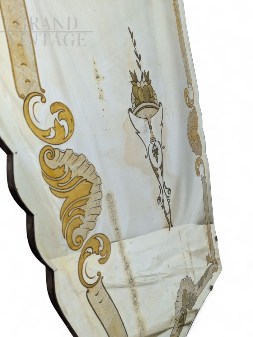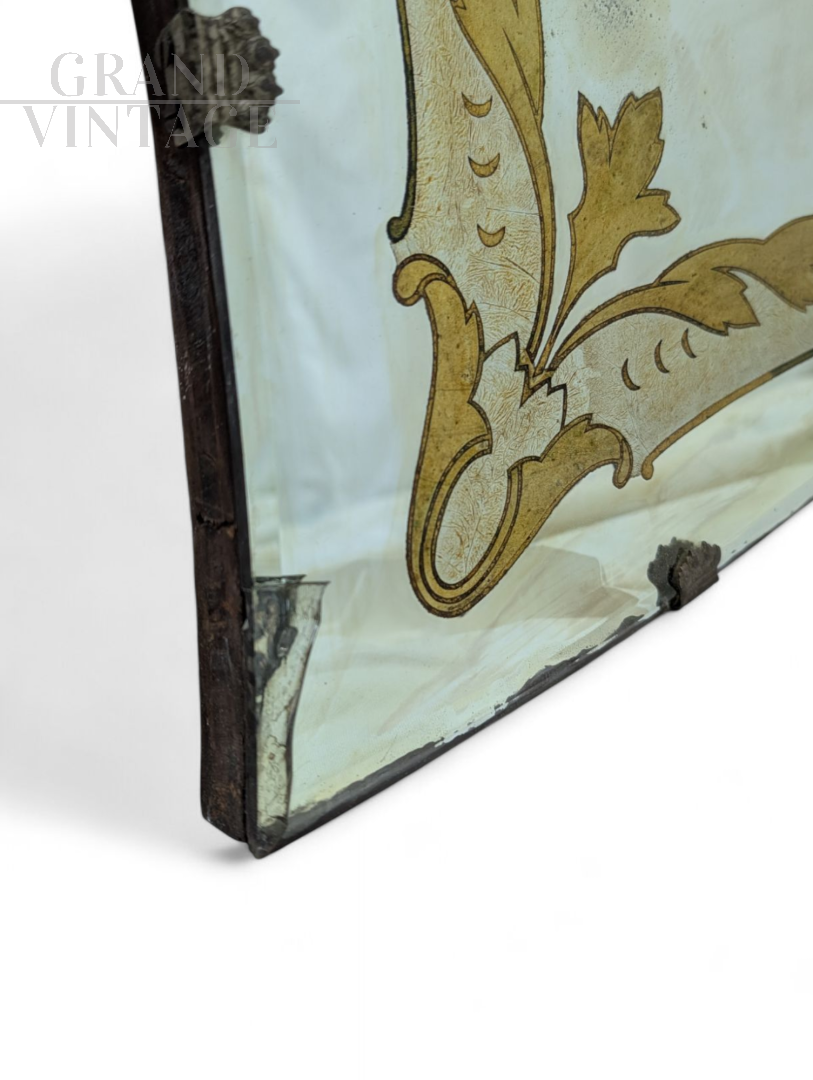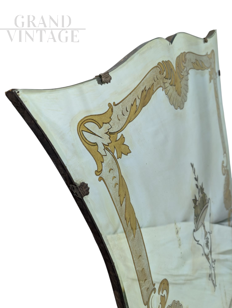 Specchio liberty italiano da parete a figura intera dei primi anni del '900 in vetro molato con magnifiche decorazioni dorate, in buone condizioni, presenta una crepatura sulla parte inferiore sinistra (vedi foto) e segni del tempo riflessi nel vetro.