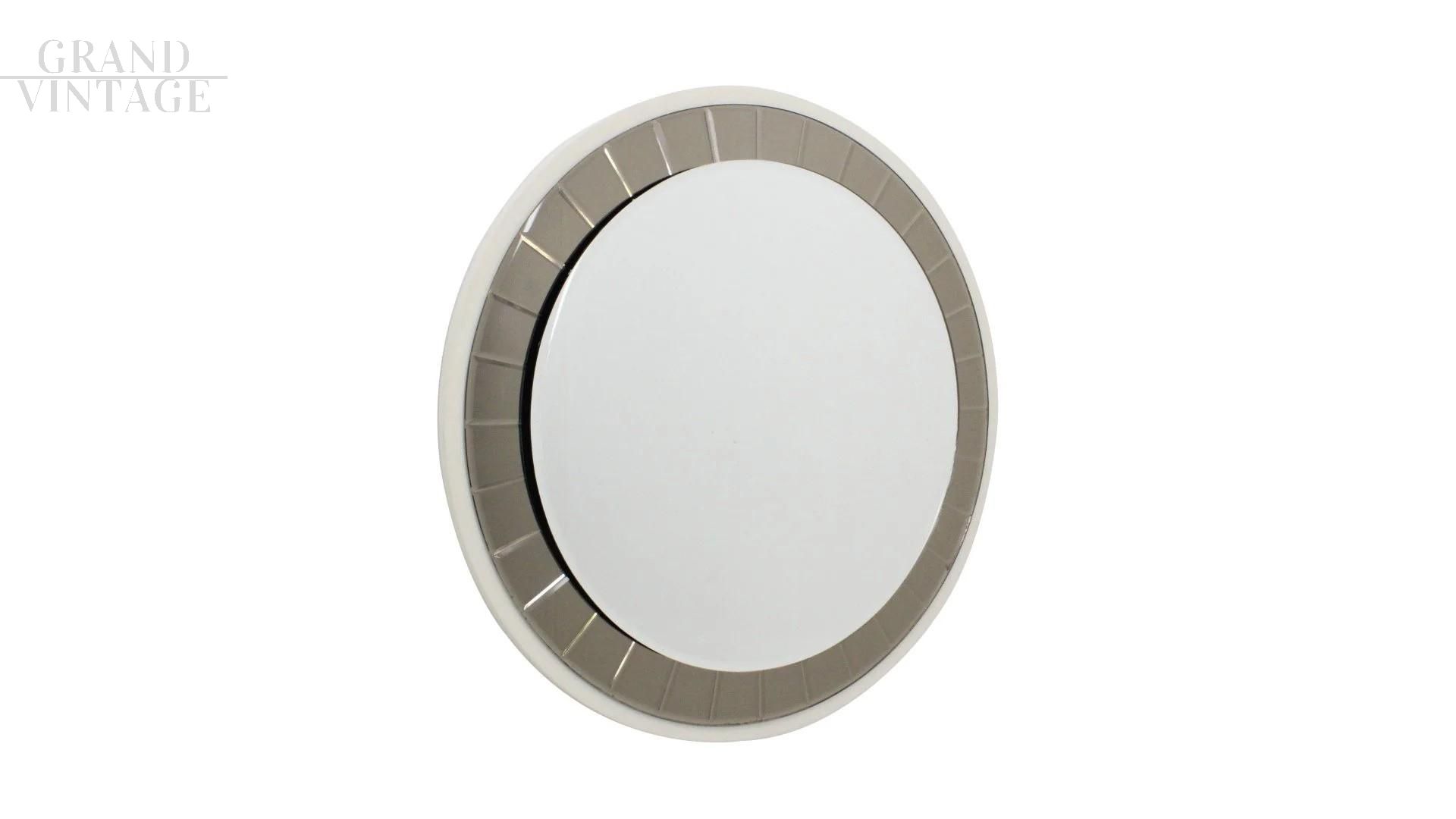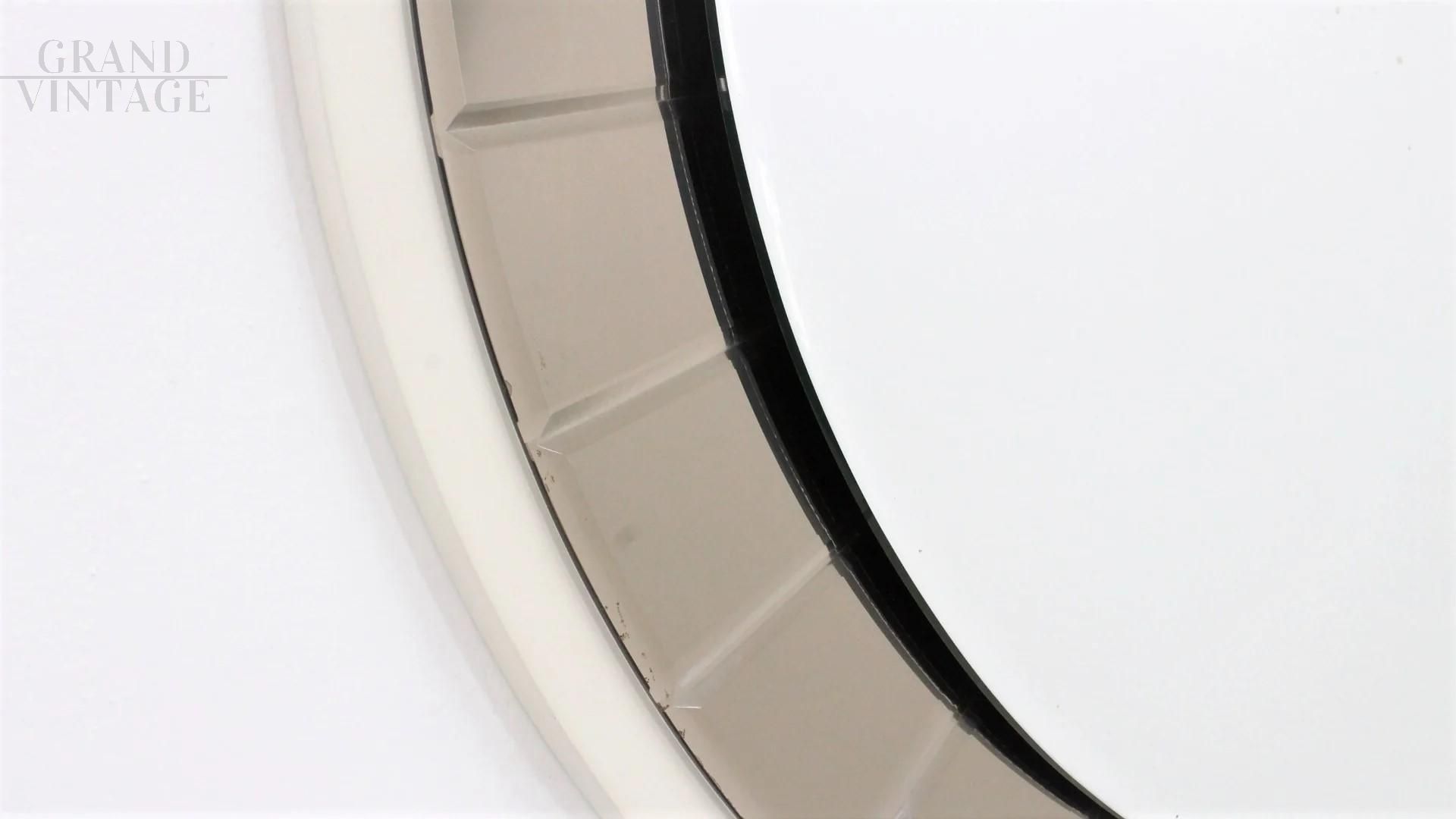 Grande specchio rotondo di modernariato italiano anni '50. La struttura è composta da un supporto in legno laccato bianco e uno specchio in doppio vetro molato. Ottime condizioni.