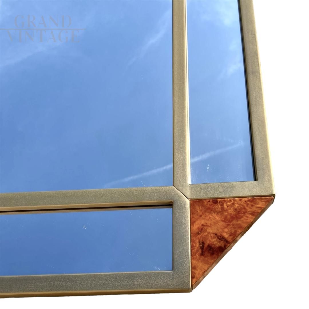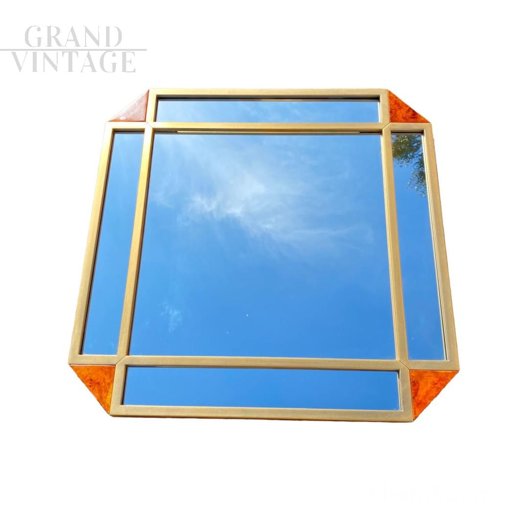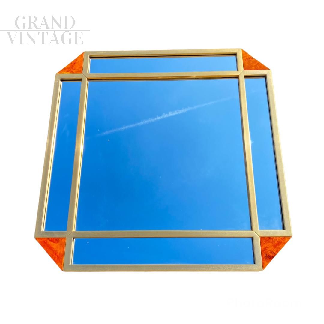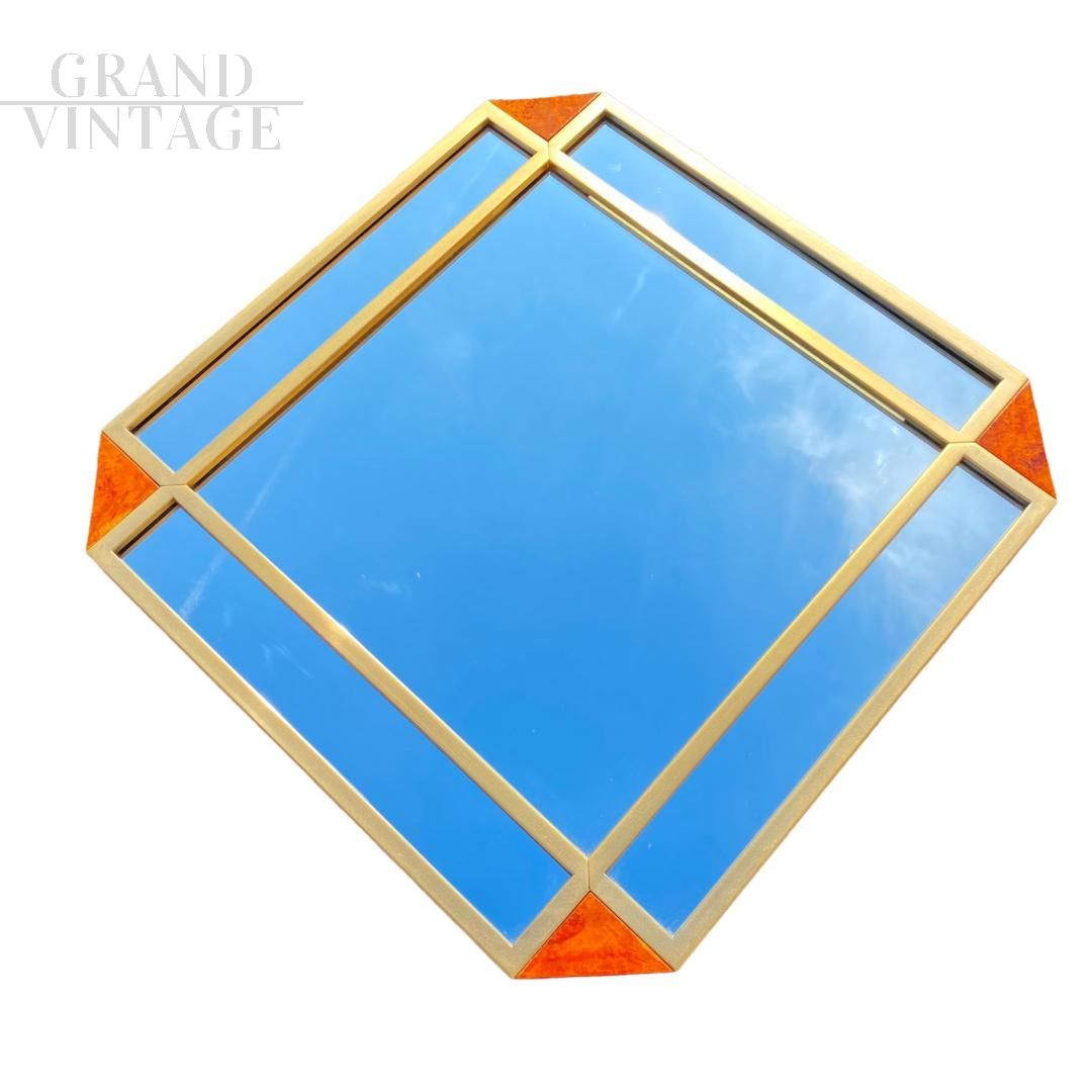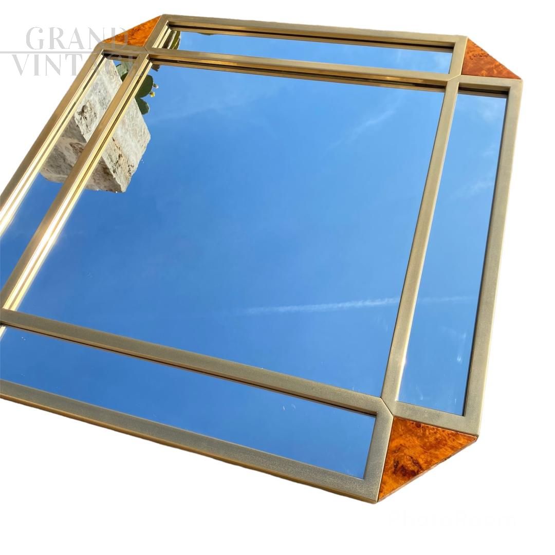 Splendido specchio Mirette disegnato da Gianluigi Gorgoni per Fratelli Turri nel 1974, appartenente alla serie Privilege, realizzato in collaborazione con Casa Vogue. Lo specchio è realizzato in legno con impiallacciatura di radica di thuja negli angoli, montato su elementi metallici con placcatura in oro 18 carati. Un vero e proprio stupendo oggetto di eccellenza manifatturiera italiana degli anni Settanta. L'oggetto è in ottime condizioni d'epoca come mostrato nelle fotografie.
