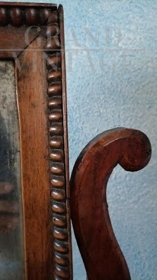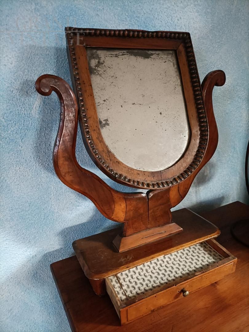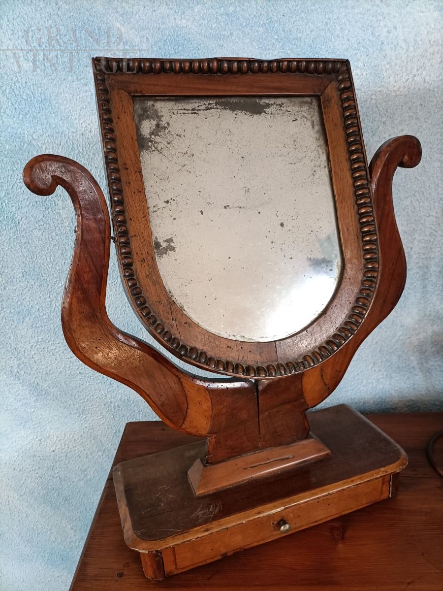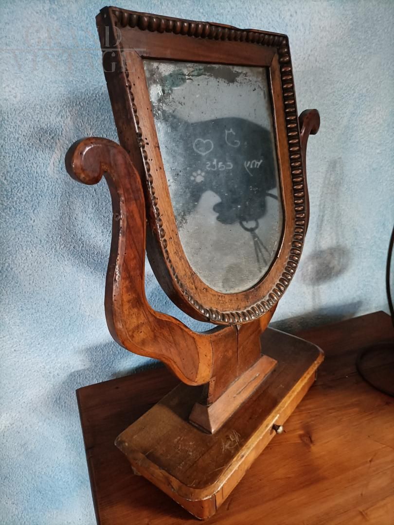Specchiera da comò antica modello Psiche di fine '800 con cassettino porta gioie, completamente restaurata mantenendone le bellissime tracce del tempo sullo specchio originale al mercurio. Le misure riportate sono da considerare massime.