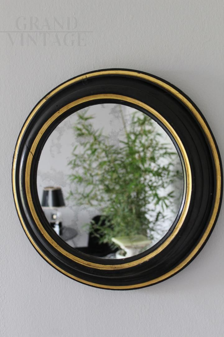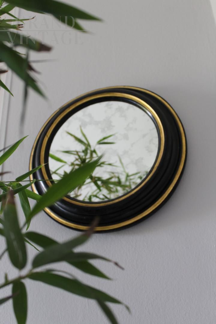 Specchio rotondo Art Déco, Italia anni '40, in legno massiccio laccato in colore nero con decori in foglia oro, super scenografico, perfetto per arredare qualsiasi spazio e ambiente.