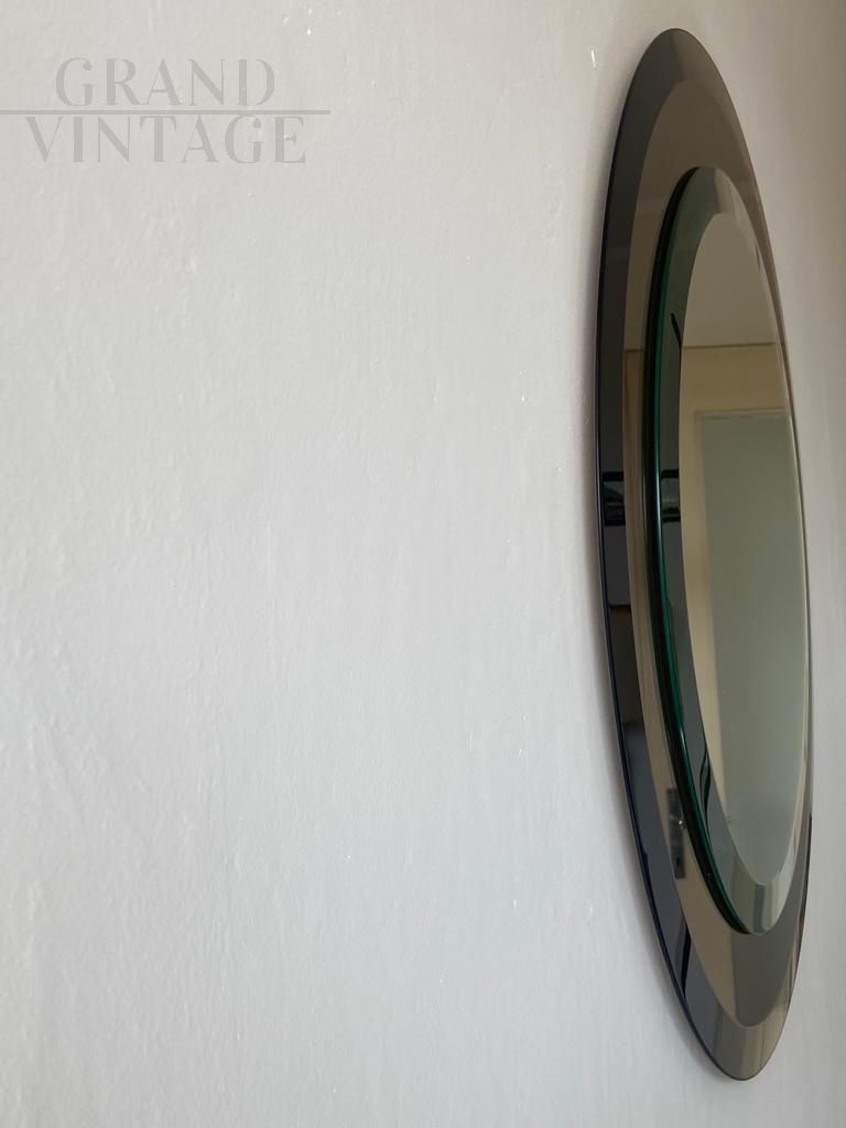 Specchio rotondo vintage firmato Lupi Cristal Luxor in cristallo molato fumé, Italia anni '70.