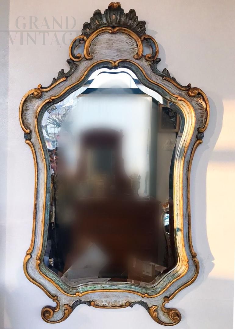 Specchio veneziano antico di fine '700 - inizi '800, molato e con cornice in legno elegantemente scolpita in foglia d'oro e stucchi, interamente restaurato.