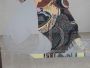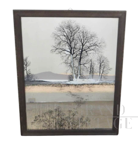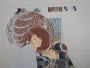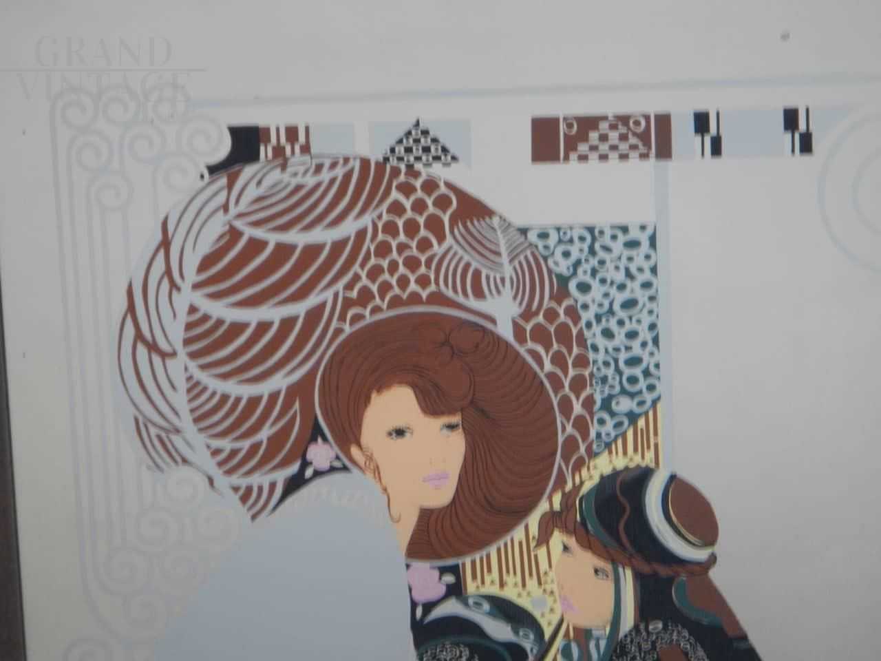 Specchio design di Saggers & Co. Ltd con disegno di donna e bambina stampato, Inghilterra 1979, completo di cornice in legno di abete. In buone condizioni, la cornice ha un difetto. Il retro è in legno compresso.