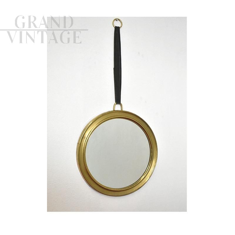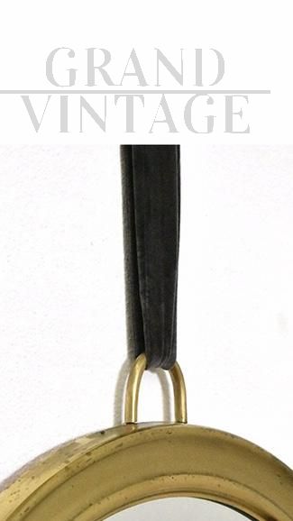 Specchio vintage circolare anni Cinquanta, manifattura Italiana. Lo specchio presenta una cornice in ottone e una cordoncino in velluto grigio topo, con un anello finale in ottone per l'affissione.
