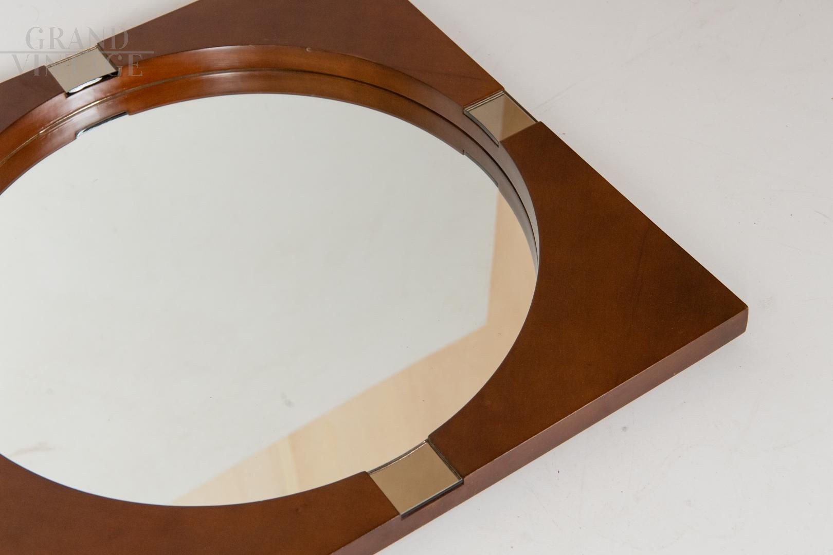 Specchio vintage rotondo con cornice quadrata impiallacciata in teak e con dettagli in ferro cromato, Italia anni '70. In ottime condizioni, con piccoli naturali segni del tempo.