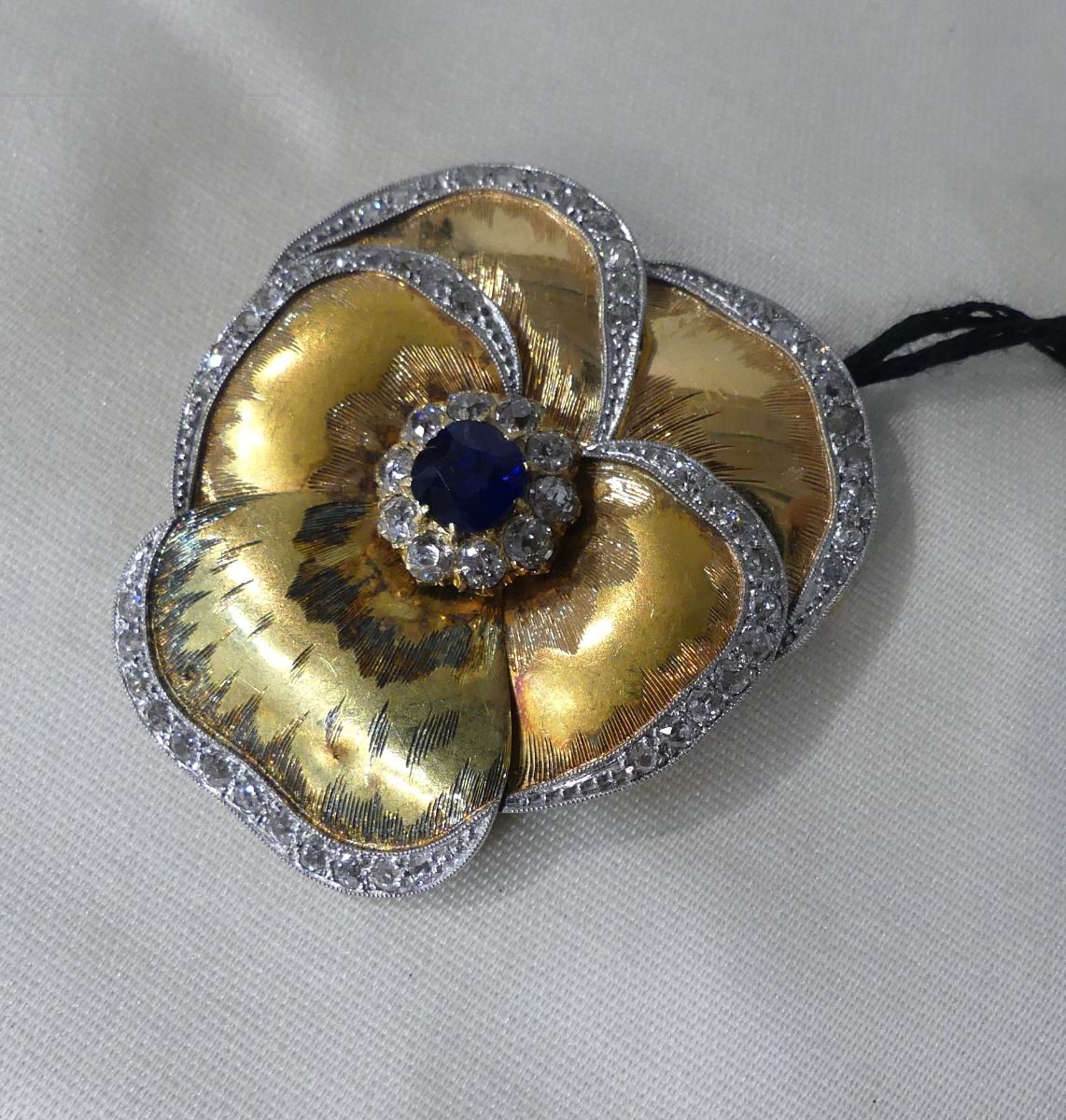 Spilla vintage preziosa a forma di viola in oro con zaffiro centrale di circa 1.5 carati e diamanti di 2 carati, grammi dell'oro: 14.50. Originale anni '60.