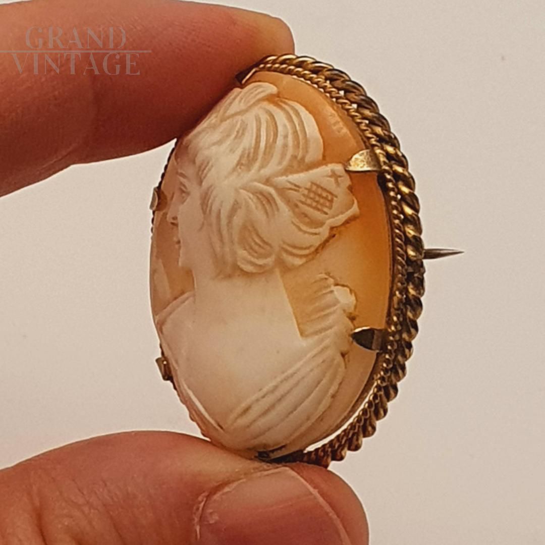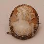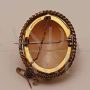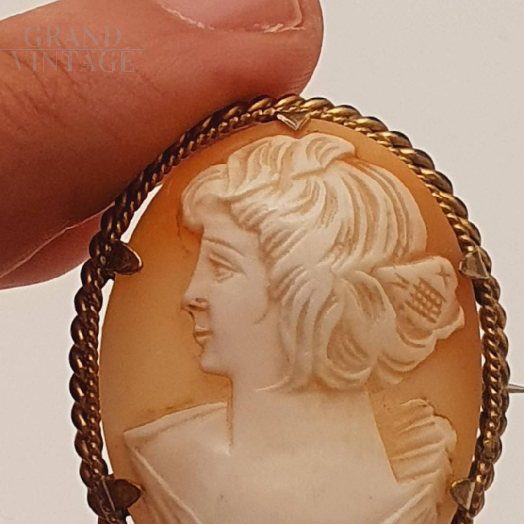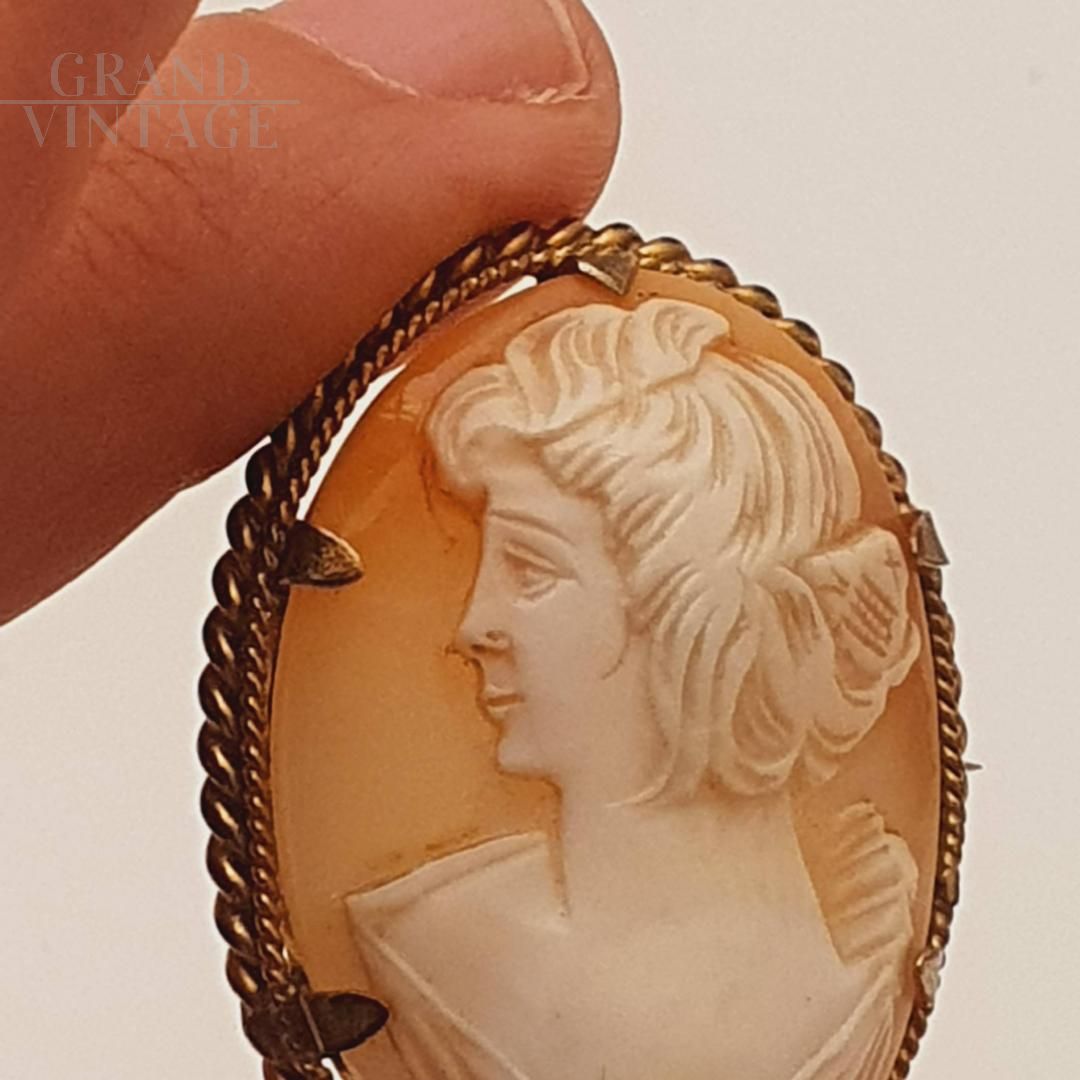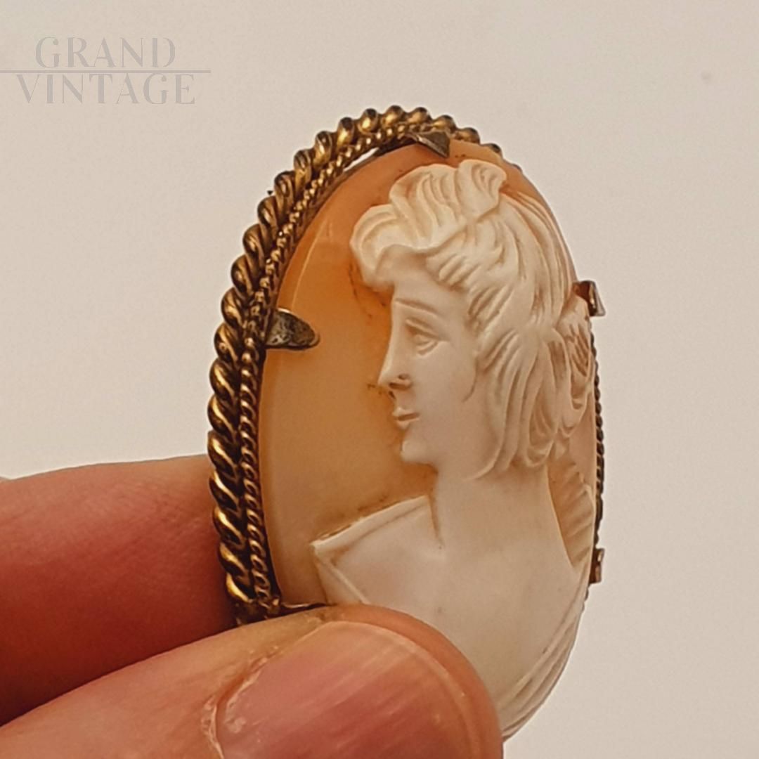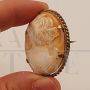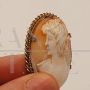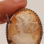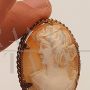 Raffinata spilla con cammeo originale d'epoca, la montatura è in argento dorato e il cammeo raffigura un profilo di donna sul tipico sfondo rosa.