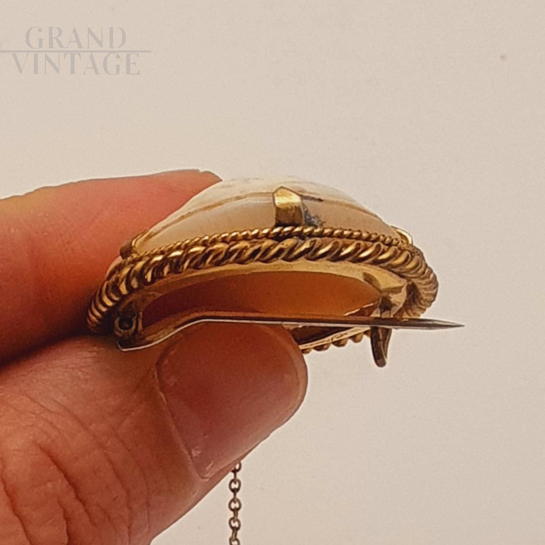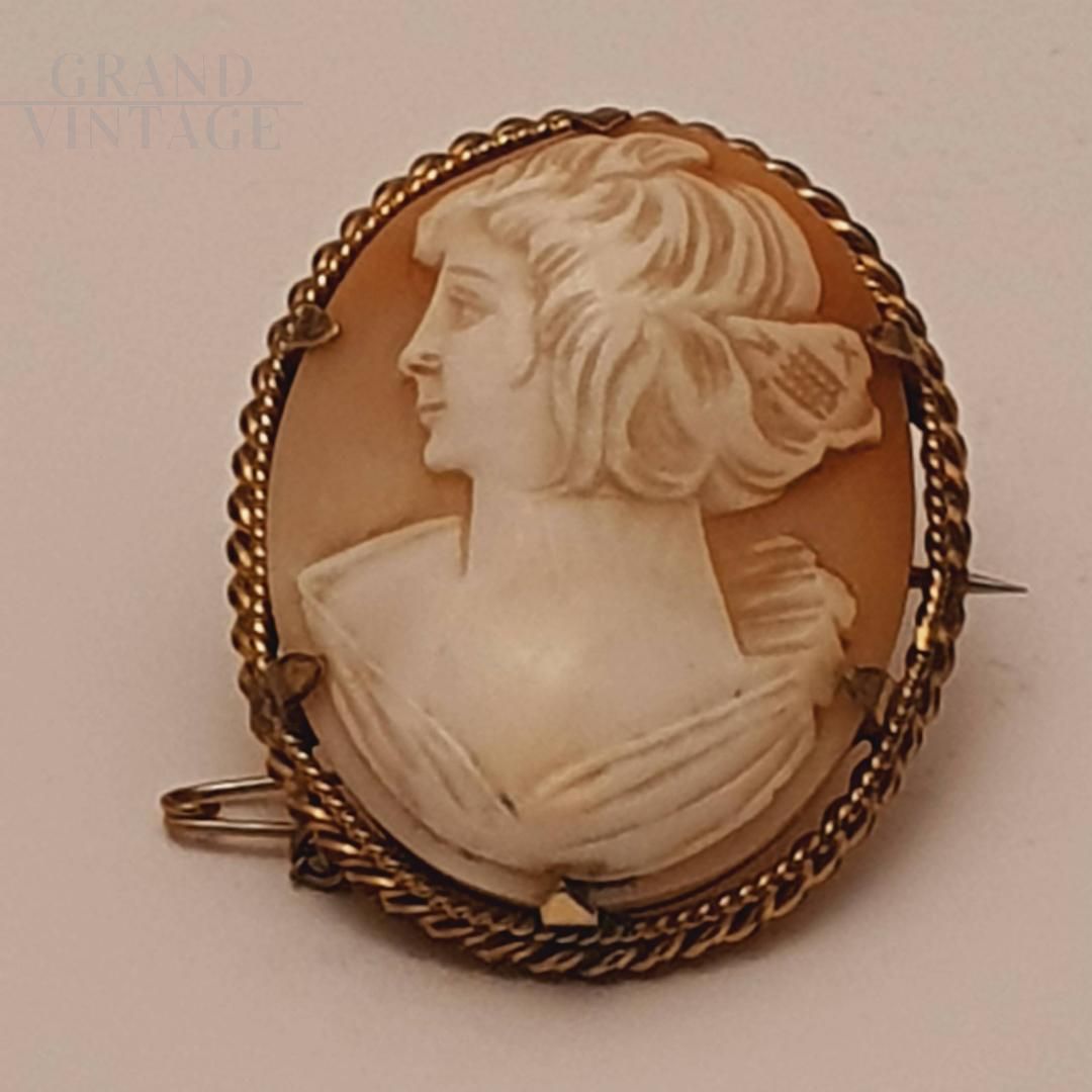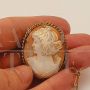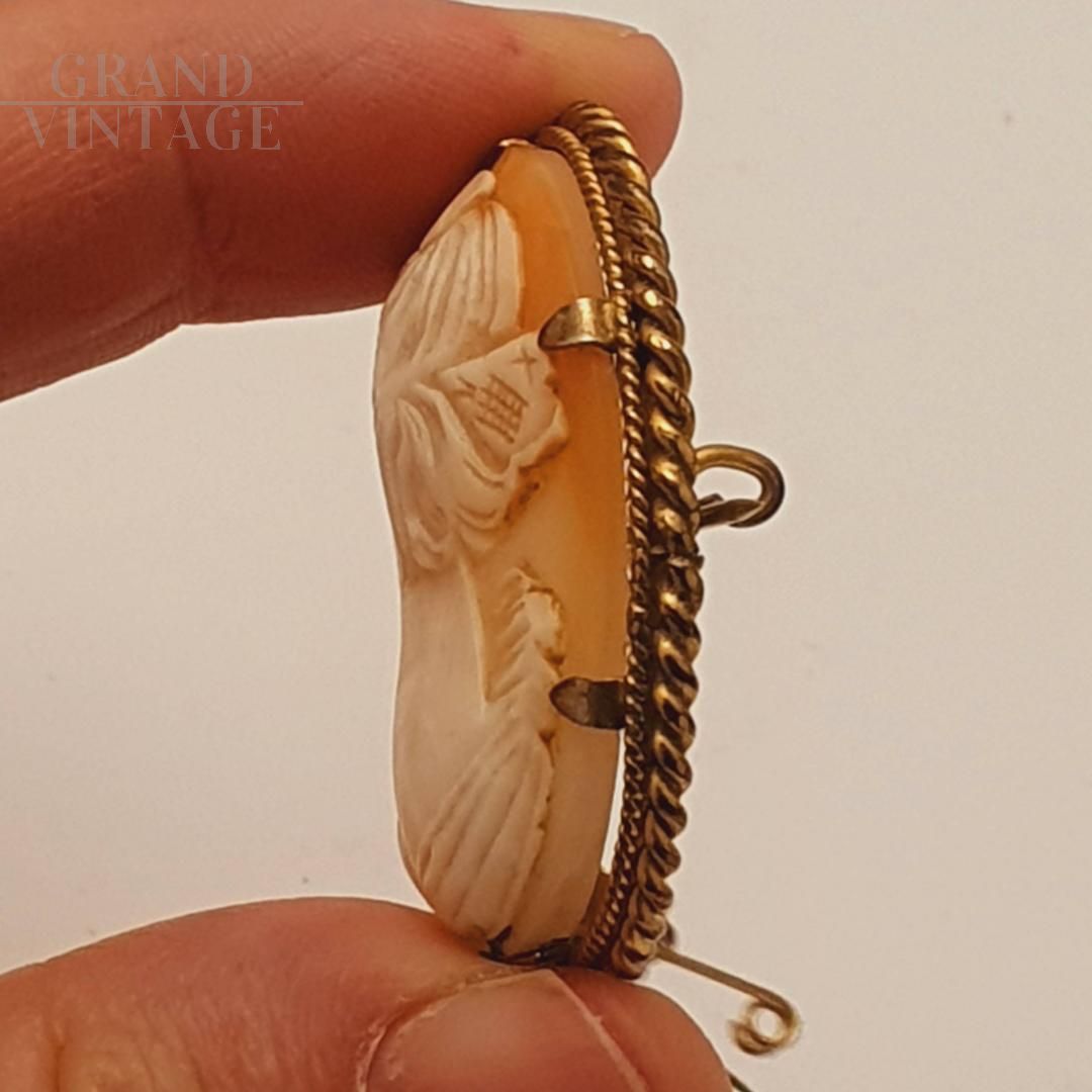 Raffinata spilla con cammeo originale d'epoca, la montatura è in argento dorato e il cammeo raffigura un profilo di donna sul tipico sfondo rosa.