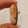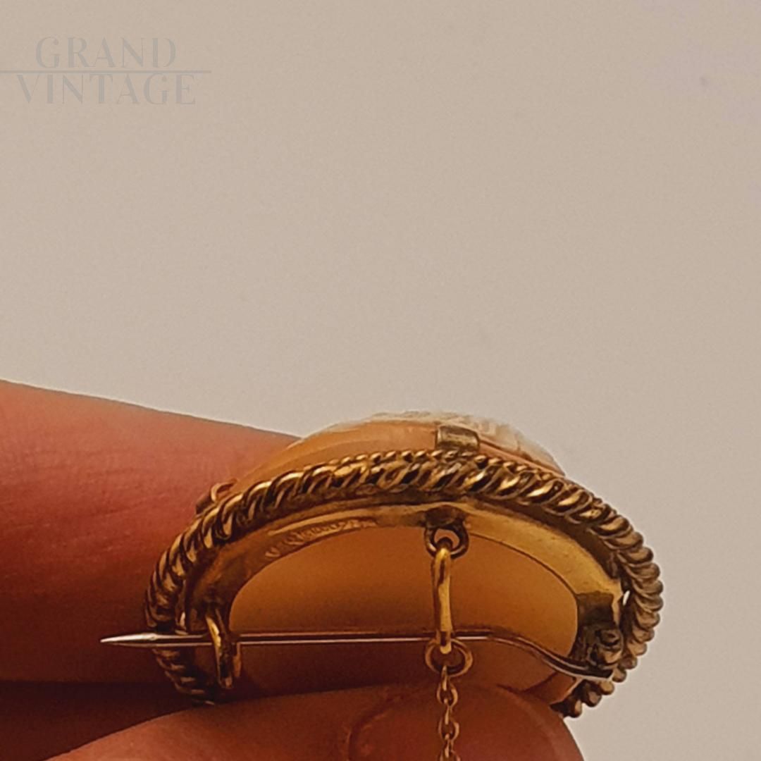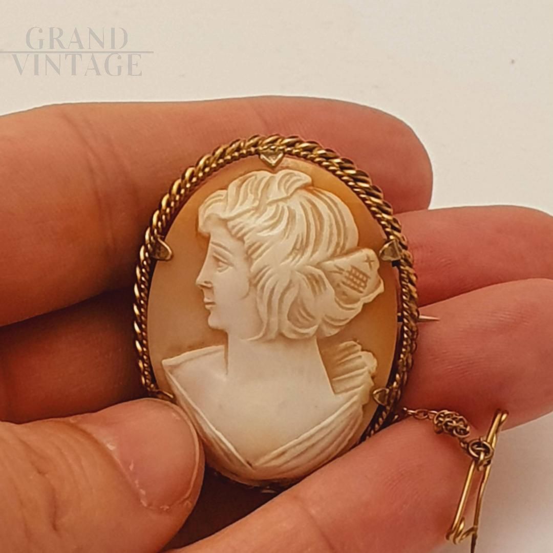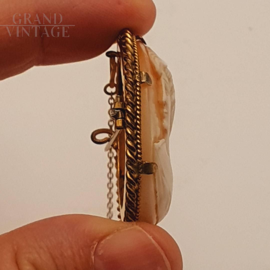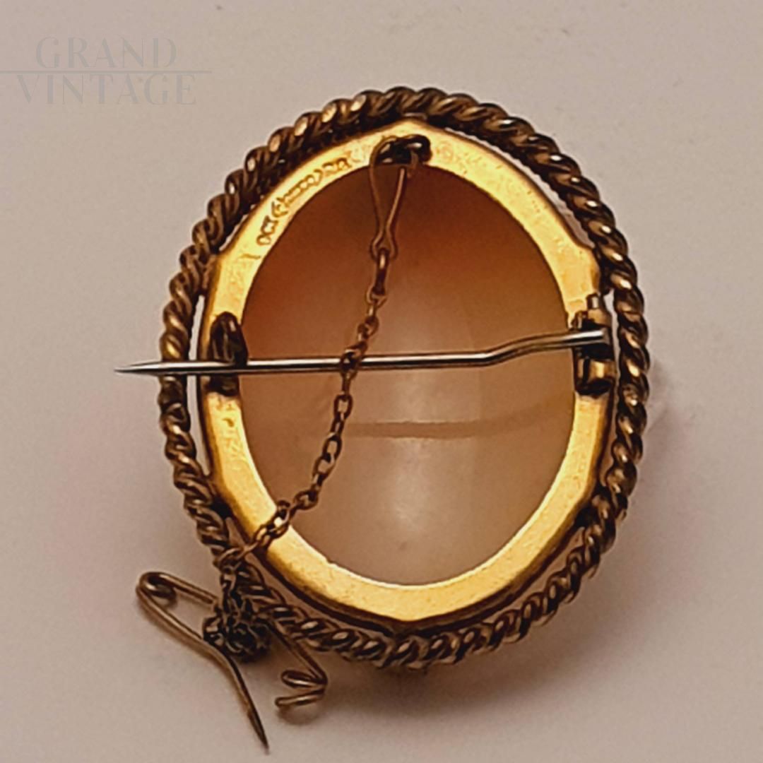 Raffinata spilla con cammeo originale d'epoca, la montatura è in argento dorato e il cammeo raffigura un profilo di donna sul tipico sfondo rosa.