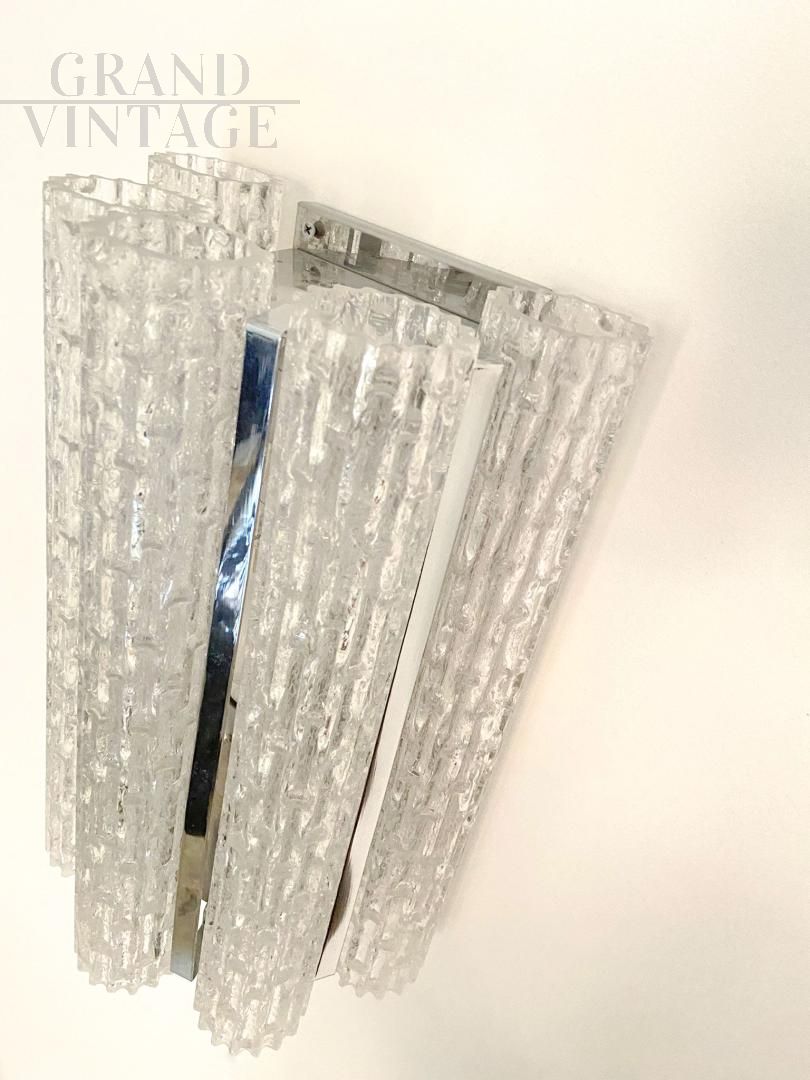 Splendida applique singola in vetro di Murano anni 70, i 5 vetri tondi abbinati ai listoni di metallo cromato creano un magnifico effetto di luce comfort. La lampada è molto scenografica e adatta a qualsiasi stanza della vostra casa.