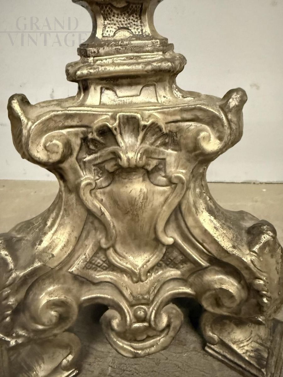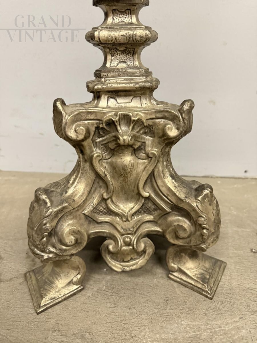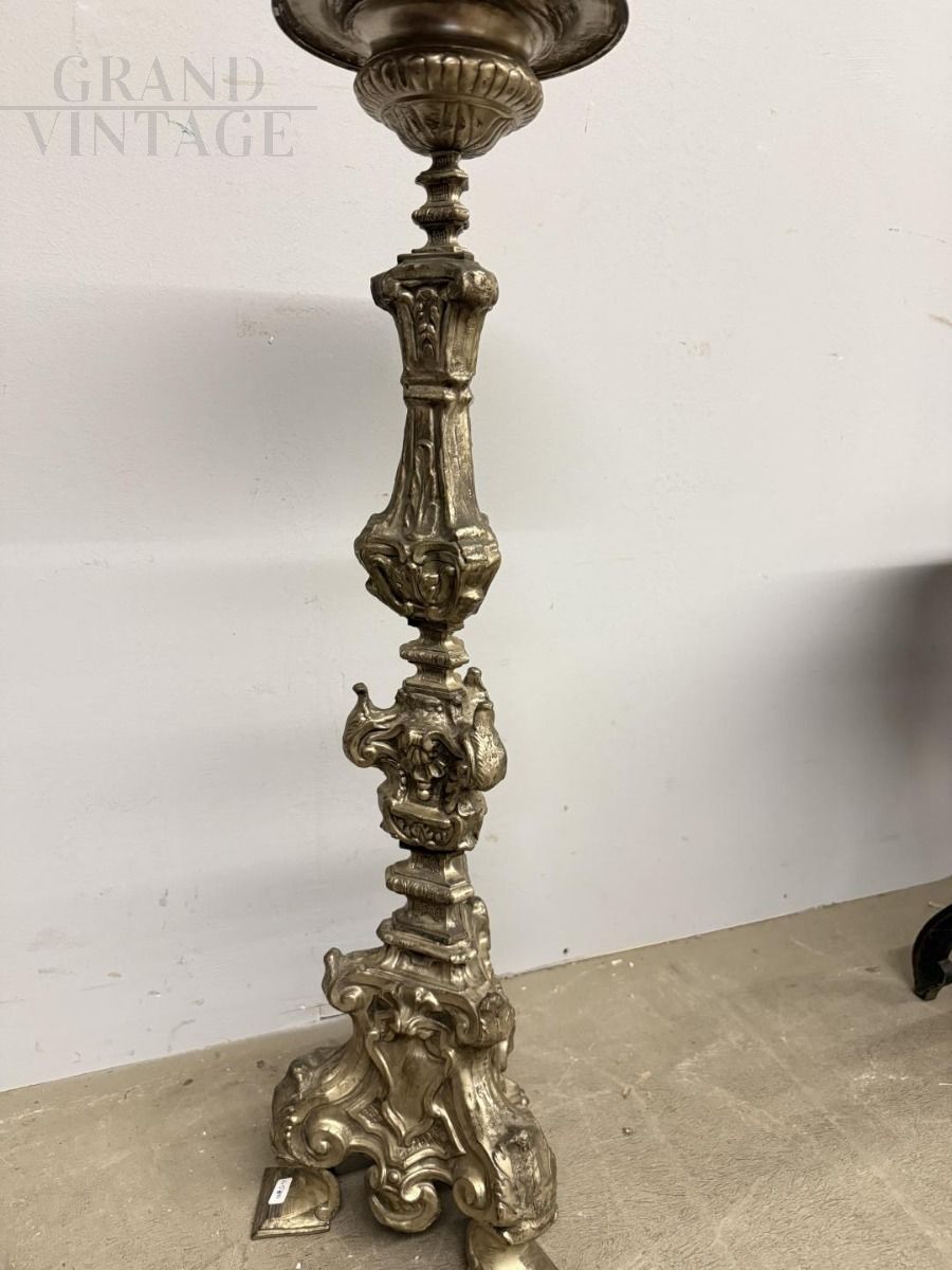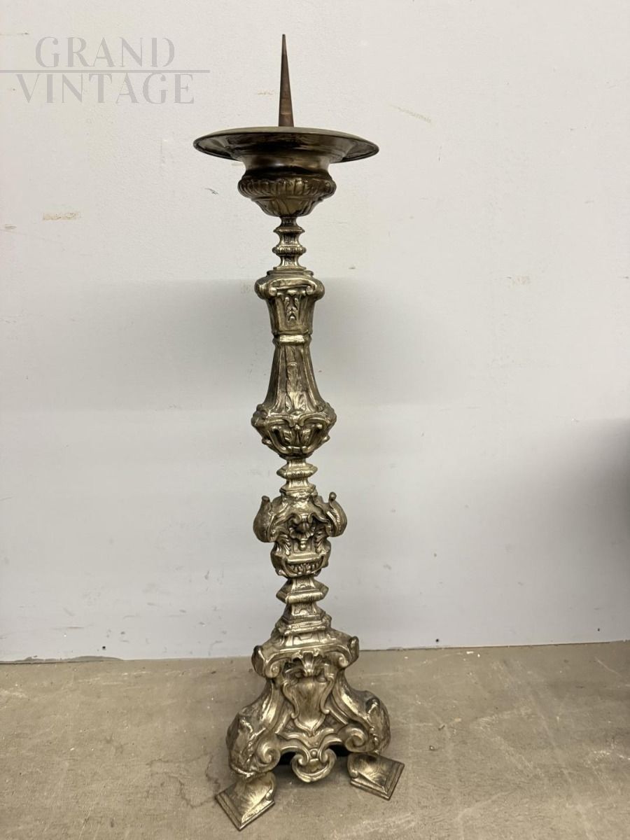 Splendido candeliere da chiesa antico del XVIII secolo in metallo argentato, 97 x 25 cm. Bellissima lavorazione a rilievo sbalzata. Stato molto buono.