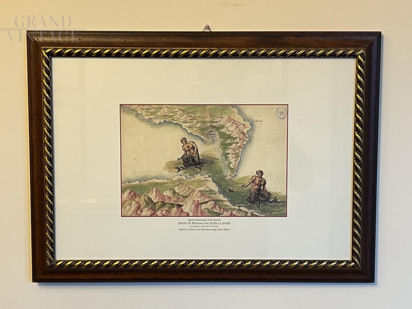Stampa a colori raffigurante lo Stretto di Messina secondo un acquarello del XVII secolo conservato nell'Archivio del Ministero degli Affari Esteri di Madrid. La stampa è incorniciata e in ottime condizioni.