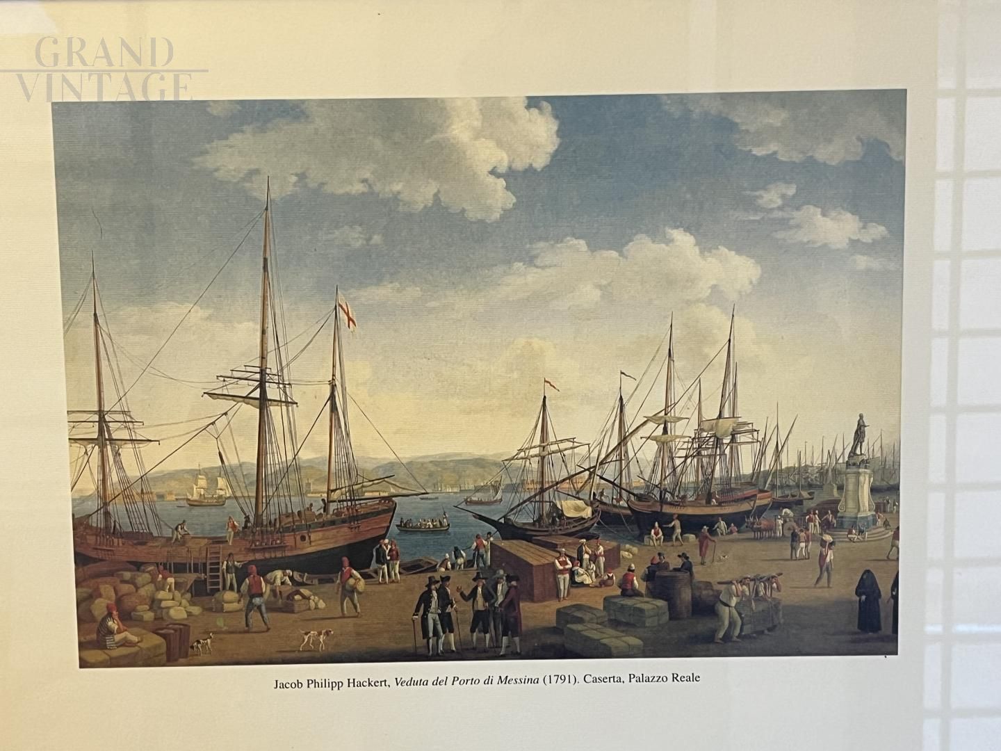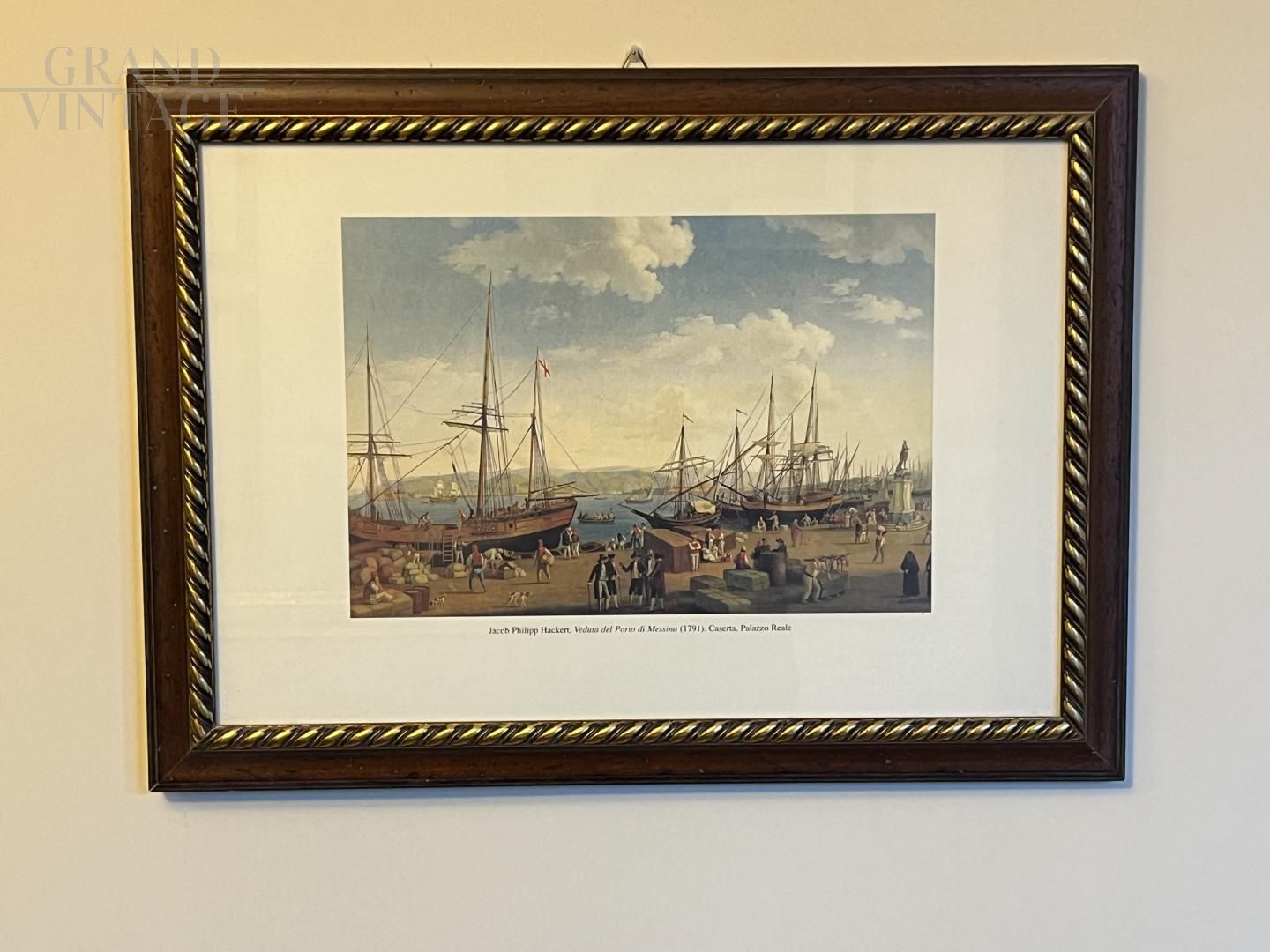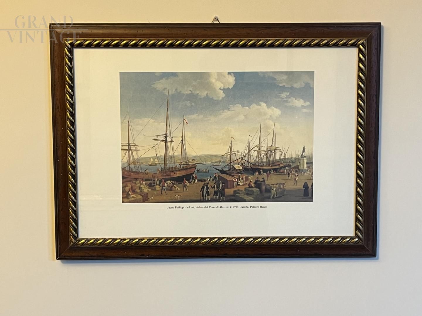 Stampa a colori con veduta del porto di Messina con navi, così come appariva nel 1791 in un dipinto di Jacob Philipp Hackert. La stampa è incorniciata e in ottime condizioni.
