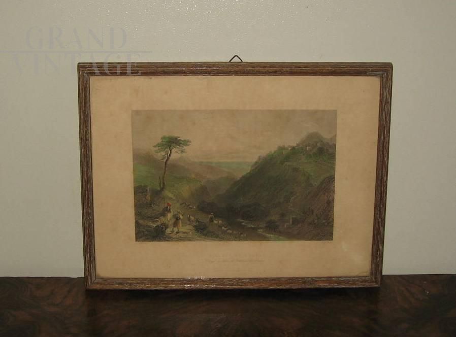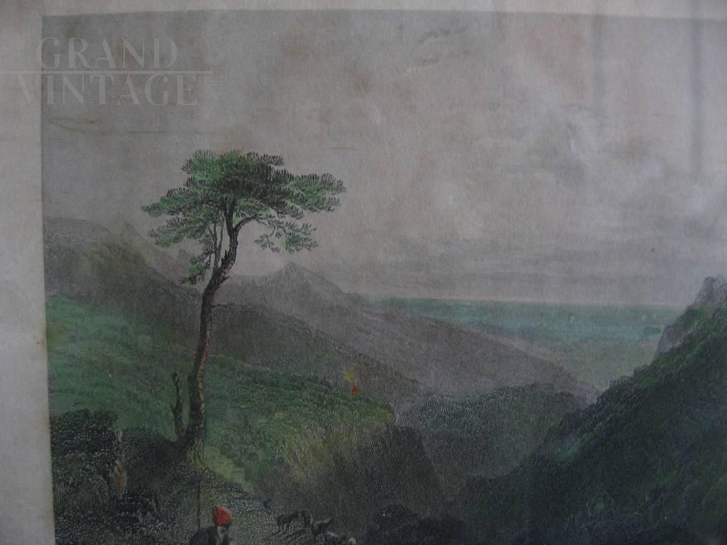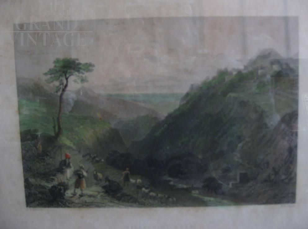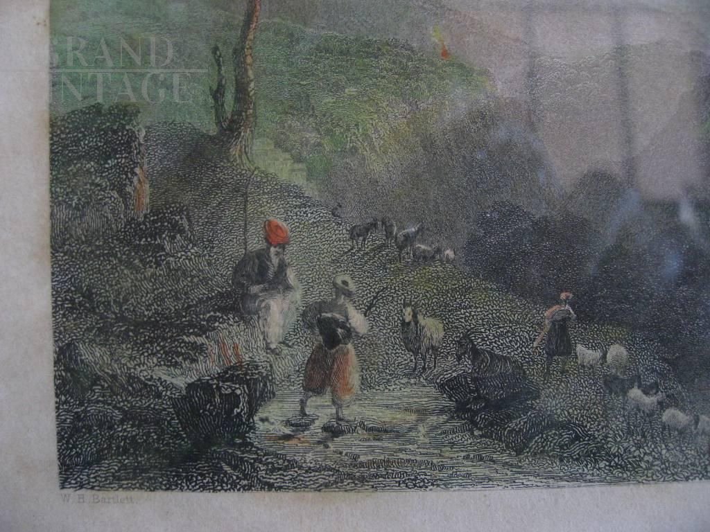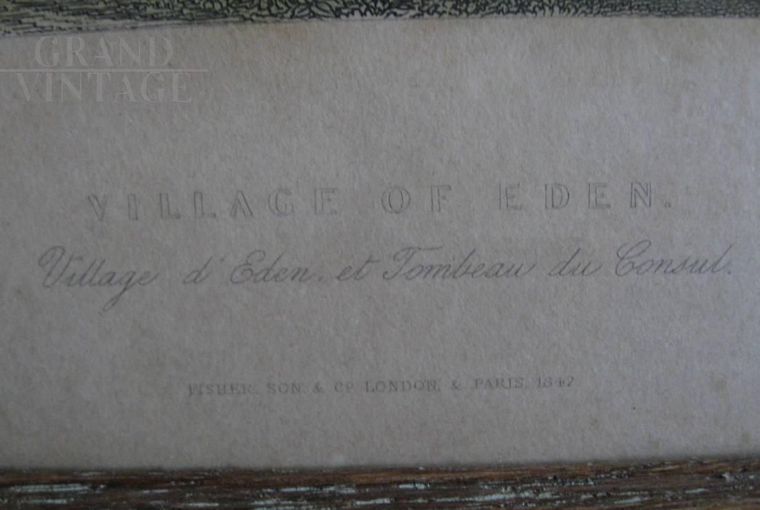 Antica stampa colorata entro cornice con vetro, dal titolo Village of Eden - Village d’Eden et Tombeau du Consul Fisher. Son. & cp. London & Paris 1842.