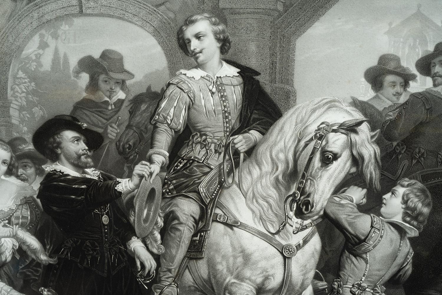 Stampa antica raffigurante Van Dyck che saluta Rubens per andare in Italia