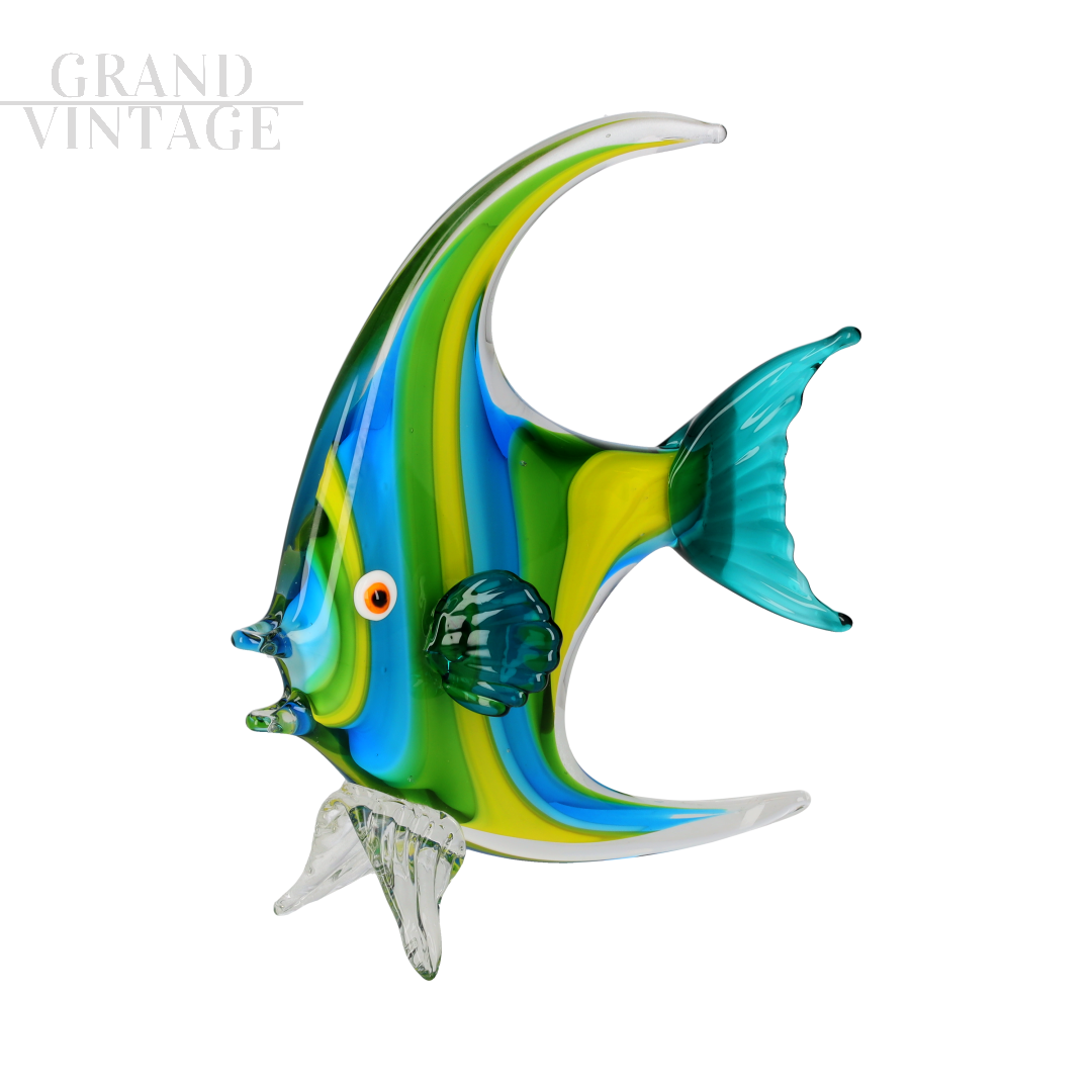 Un’elegante scultura in vetro soffiato di Murano, realizzata con maestria secondo le antiche tecniche dei maestri vetrai veneziani. Le sinuose sfumature di verde, blu e giallo si fondono armoniosamente, dando vita a un pesce stilizzato dalle linee morbide e raffinate, tipico dello stile anni ’60-’70. Un prodotto che si presta per arredare con stile la vostra casa, donando un effetto di colori unici.